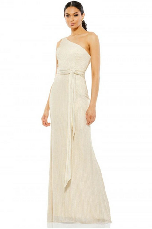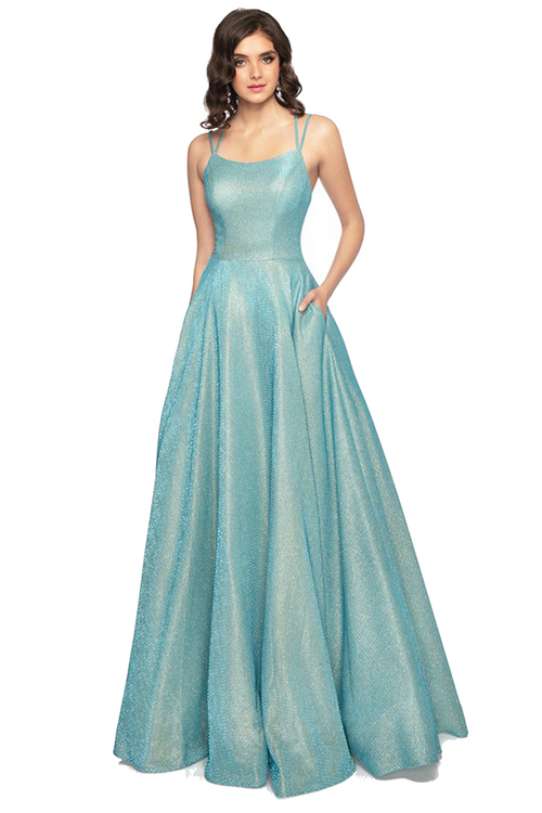 This dress features a strapless neckline with pleating detail on the bust, hot fix stones throughout the fabric, a corset bodice, a skirt slit, and a lace-up back. This is a stunning choice for your next prom or formal event.