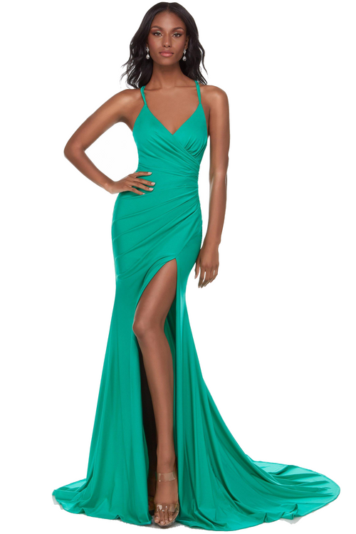 This dress features a V-neckline with cut-outs and ruching on the bodice, a fitted silhouette with a slit, and spaghetti straps. This dress is impactful and could be ideal for your next pageant, prom or formal event.