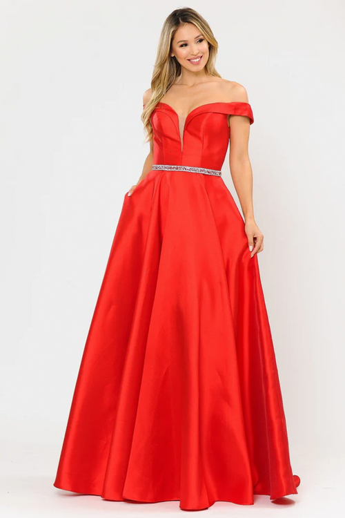 This dress features an off-the-shoulder neckline with corset boning in the bodice. It has a lac-up back and an A-line silhouette. This dress is feminine and could be ideal for your next prom or formal event.  DJ 11506