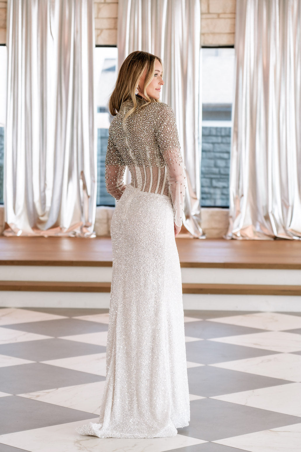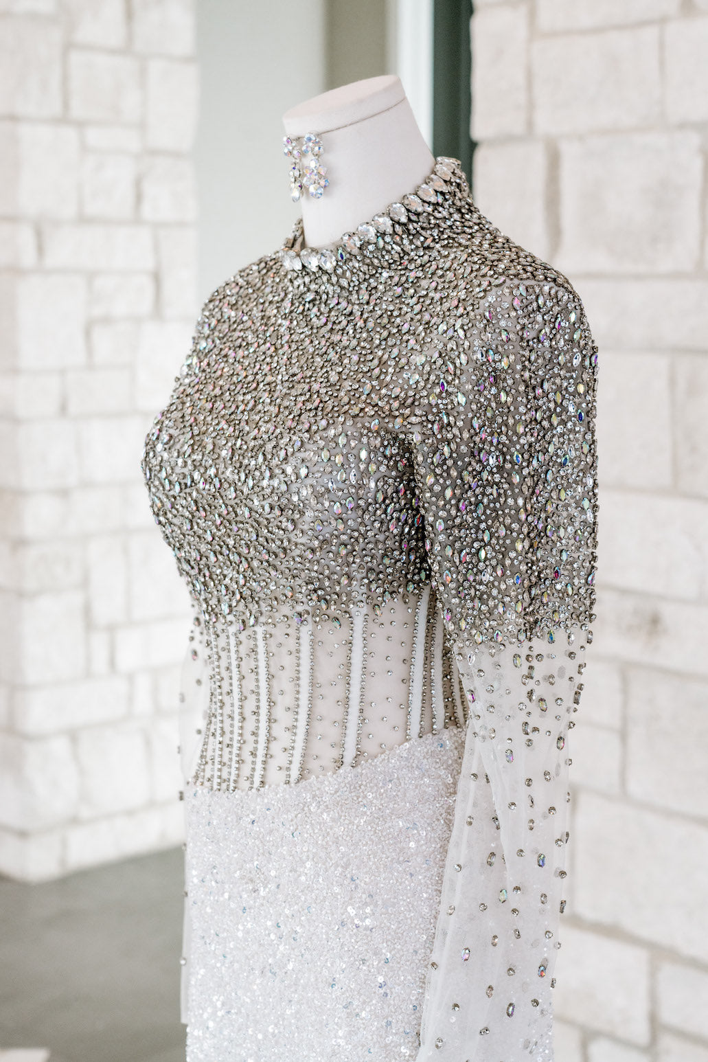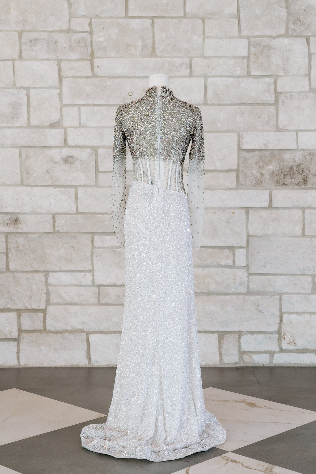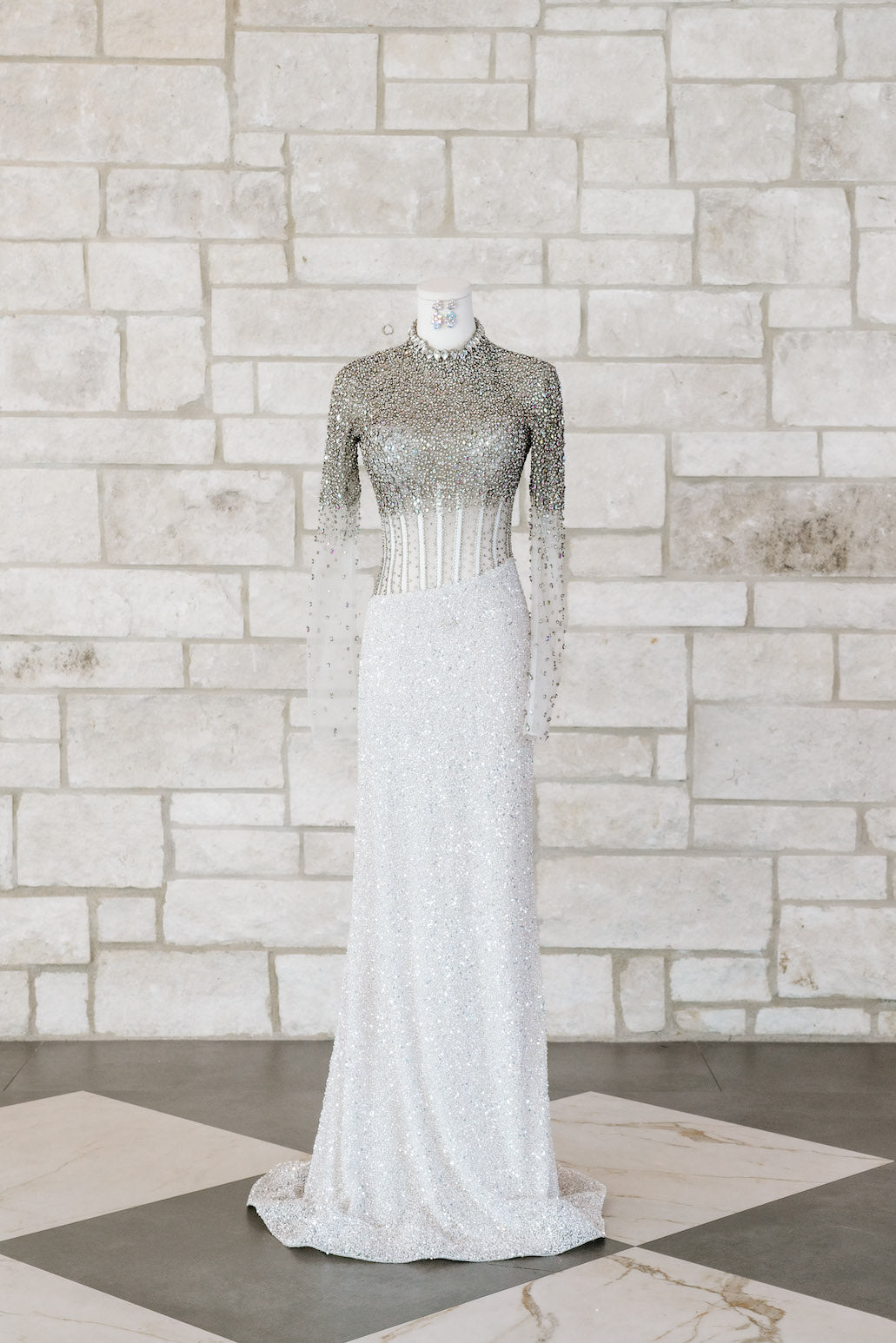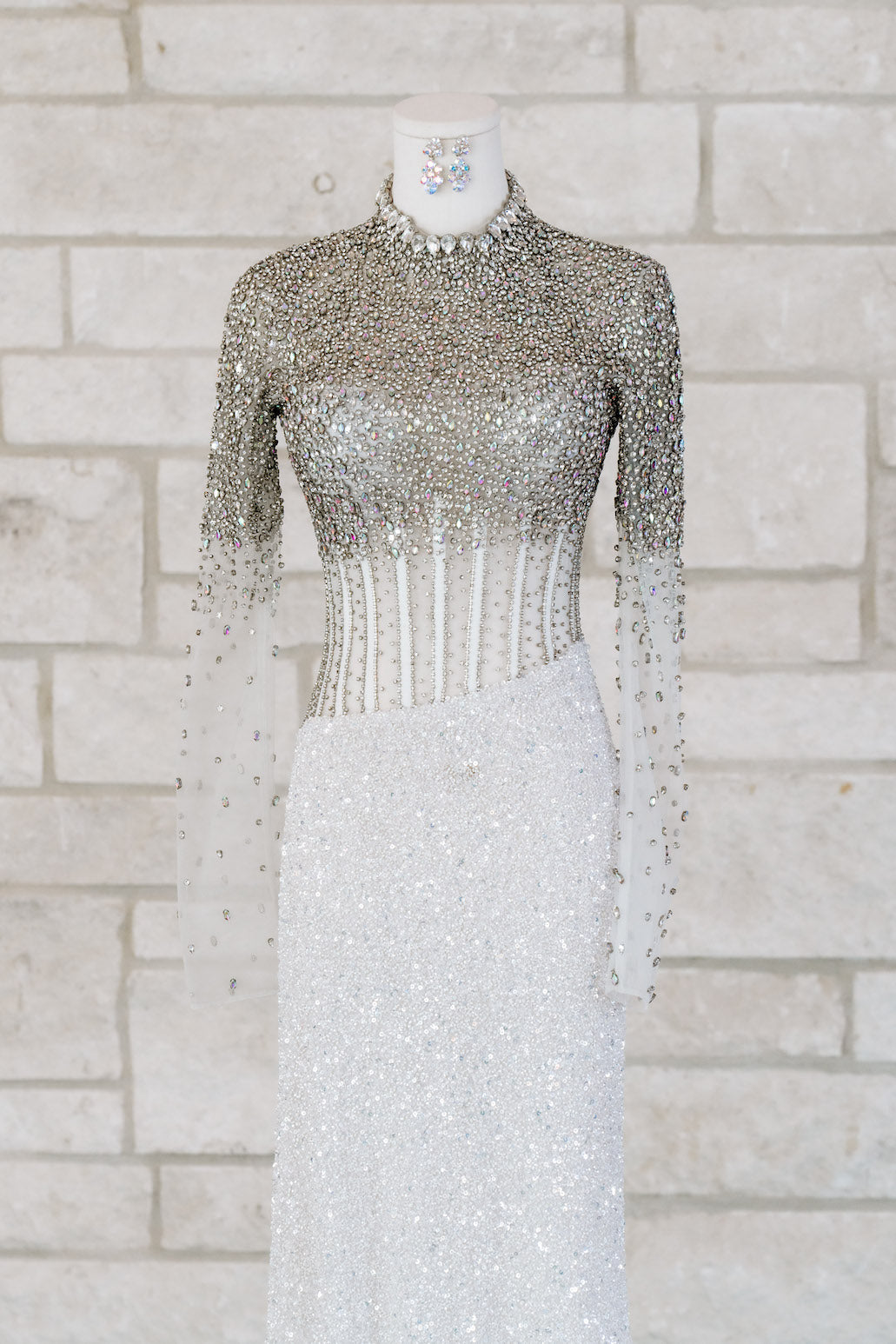 This fully beaded long-sleeve gown features an exposed corset bustier, long sleeves, and a high neckline. This is a stunning choice for your next pageant or formal event.