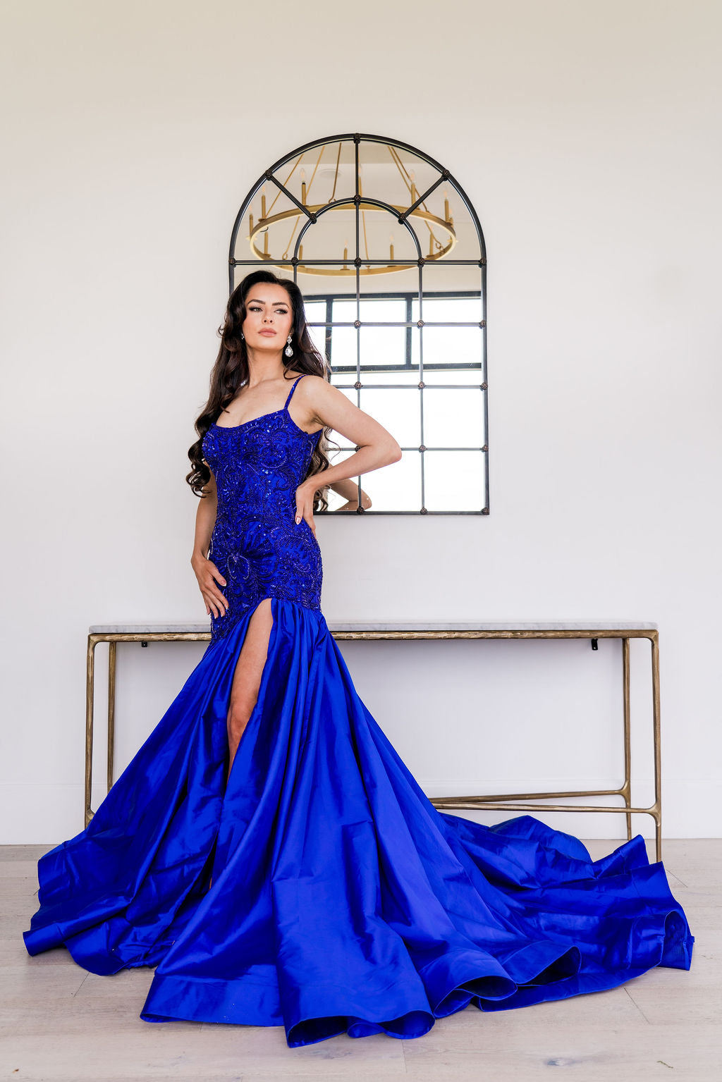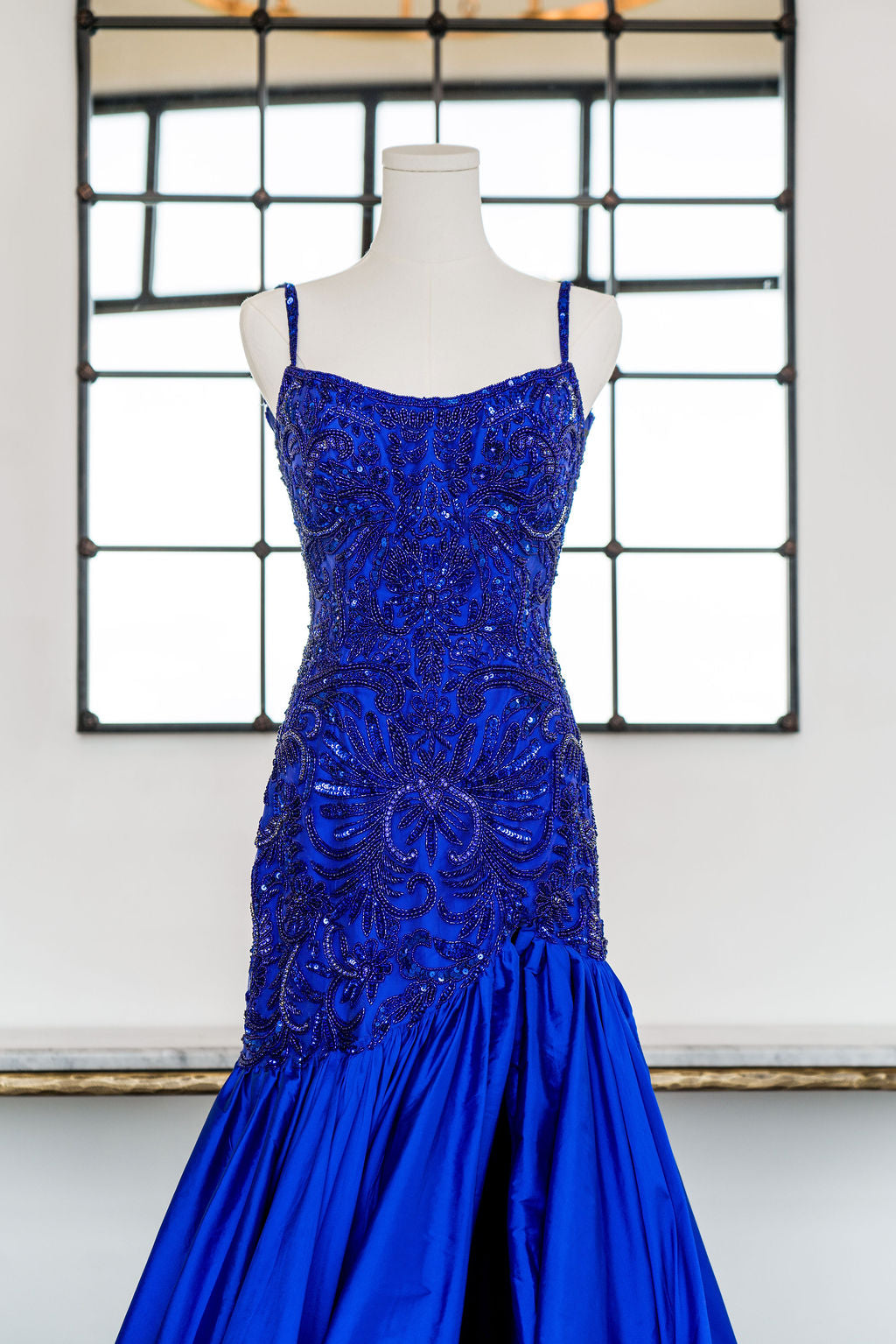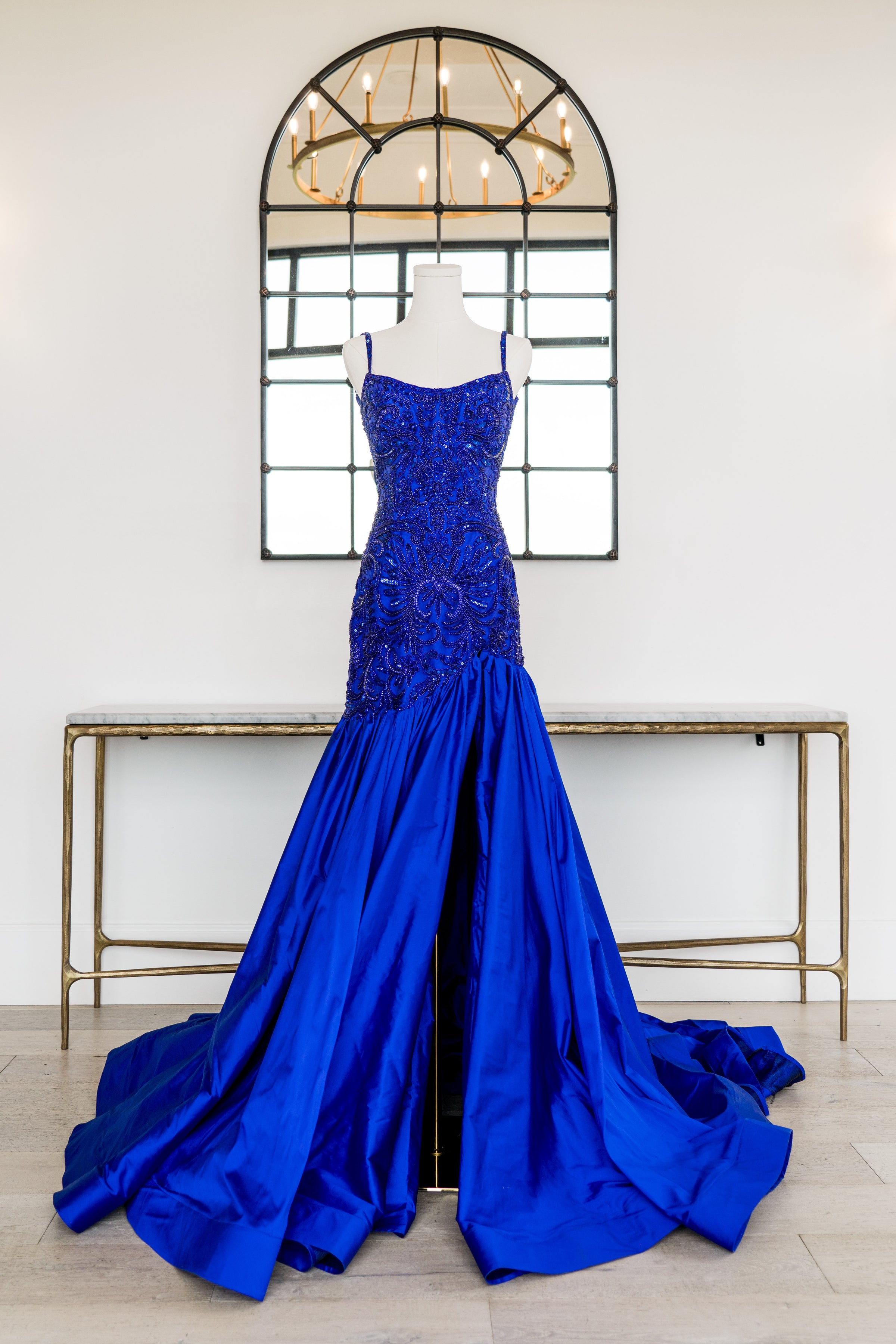 This dress features a boat neckline, spaghetti straps and an open back. The fabric is intricately beaded with a fit-and-flare taffeta skirt with a slit. Choose this unique gown for your next pageant or formal event.