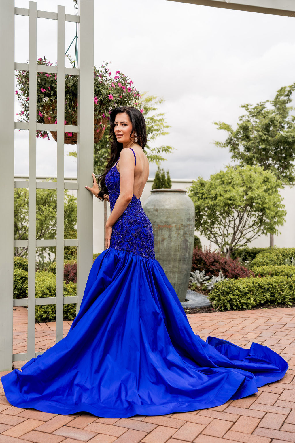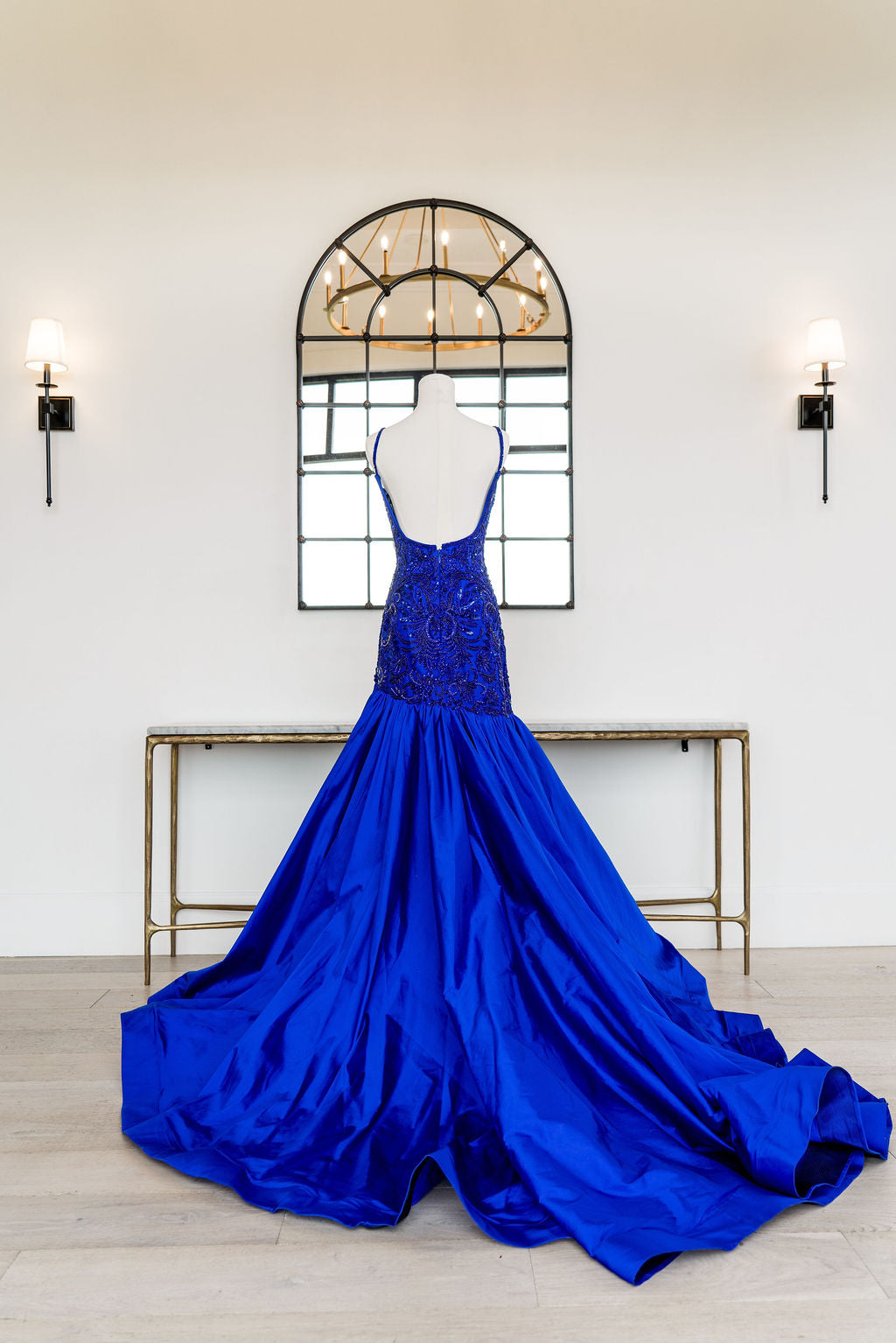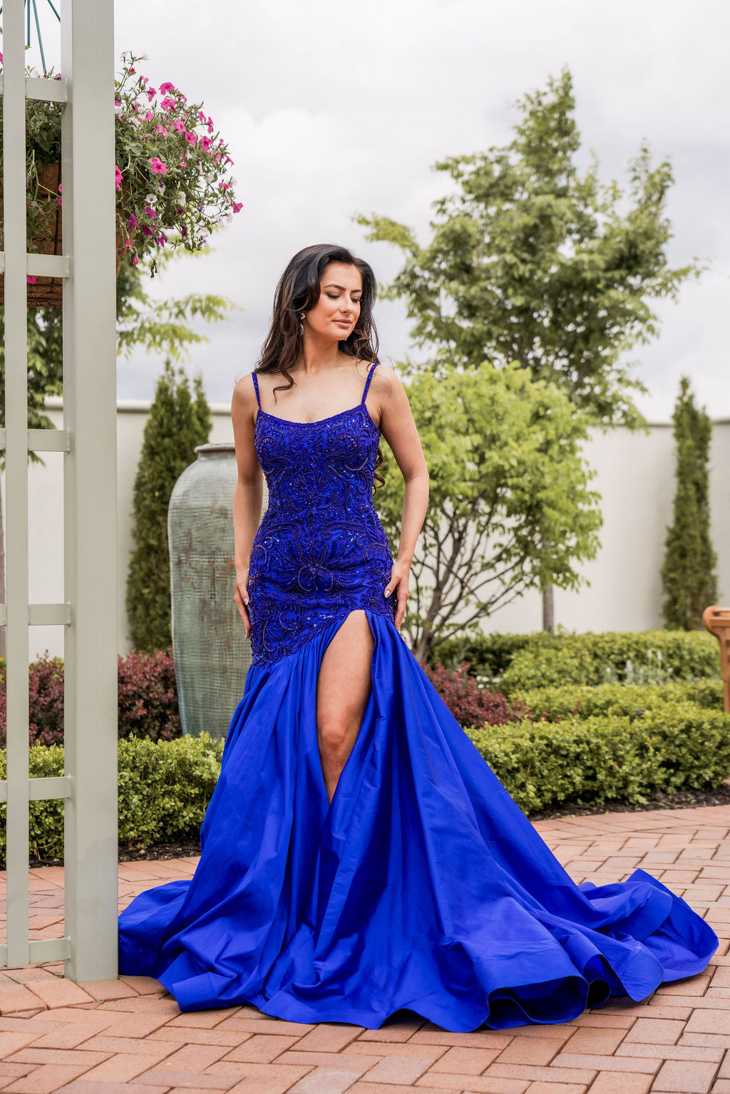 This dress features a boat neckline, spaghetti straps and an open back. The fabric is intricately beaded with a fit-and-flare taffeta skirt with a slit. Choose this unique gown for your next pageant or formal event.