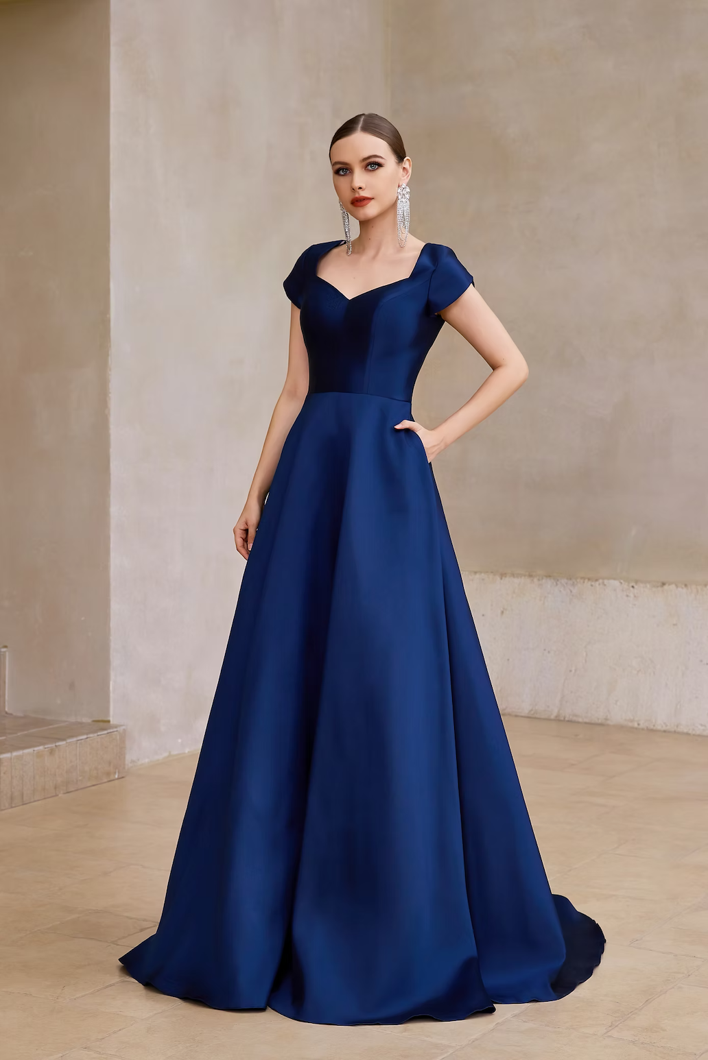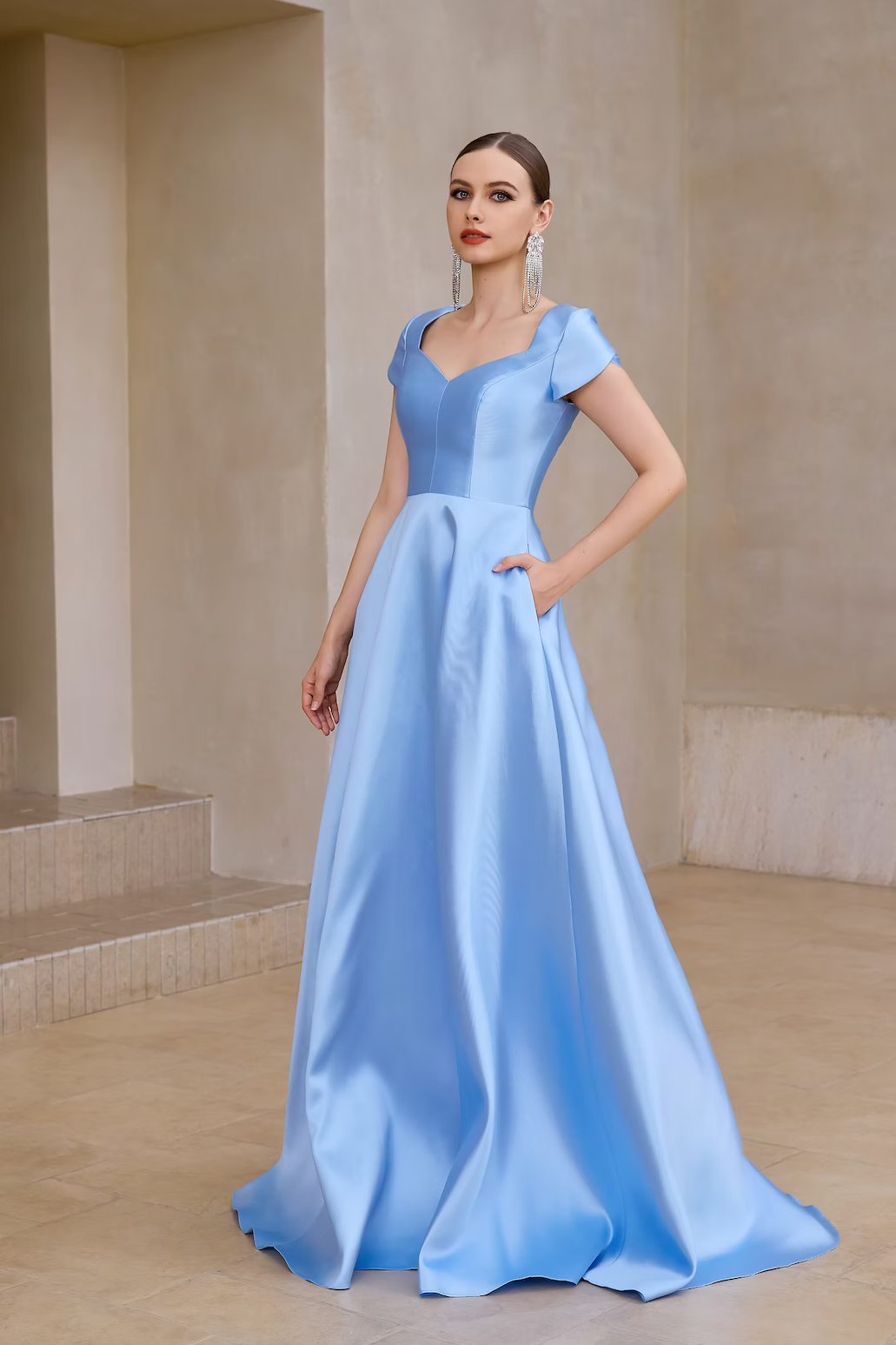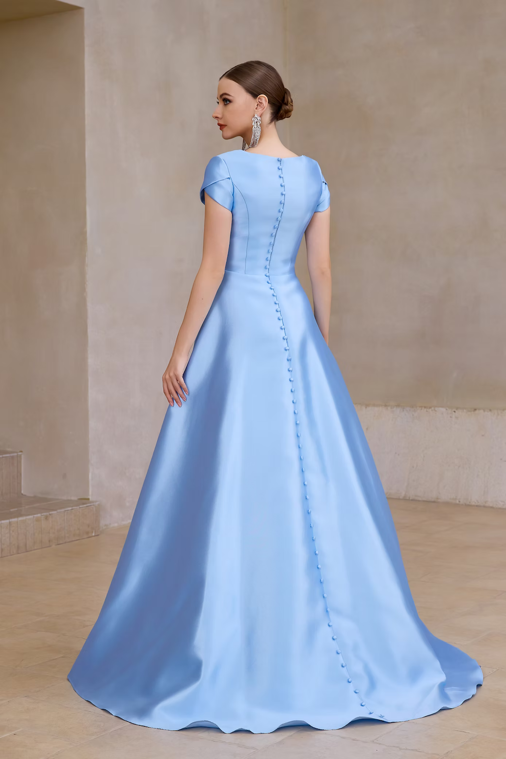 This modest dress features a Queen Anne neckline, cap sleeves, a fully covered back with buttons, and an A-line silhouette with pockets. A classic choice for your next prom or formal event.