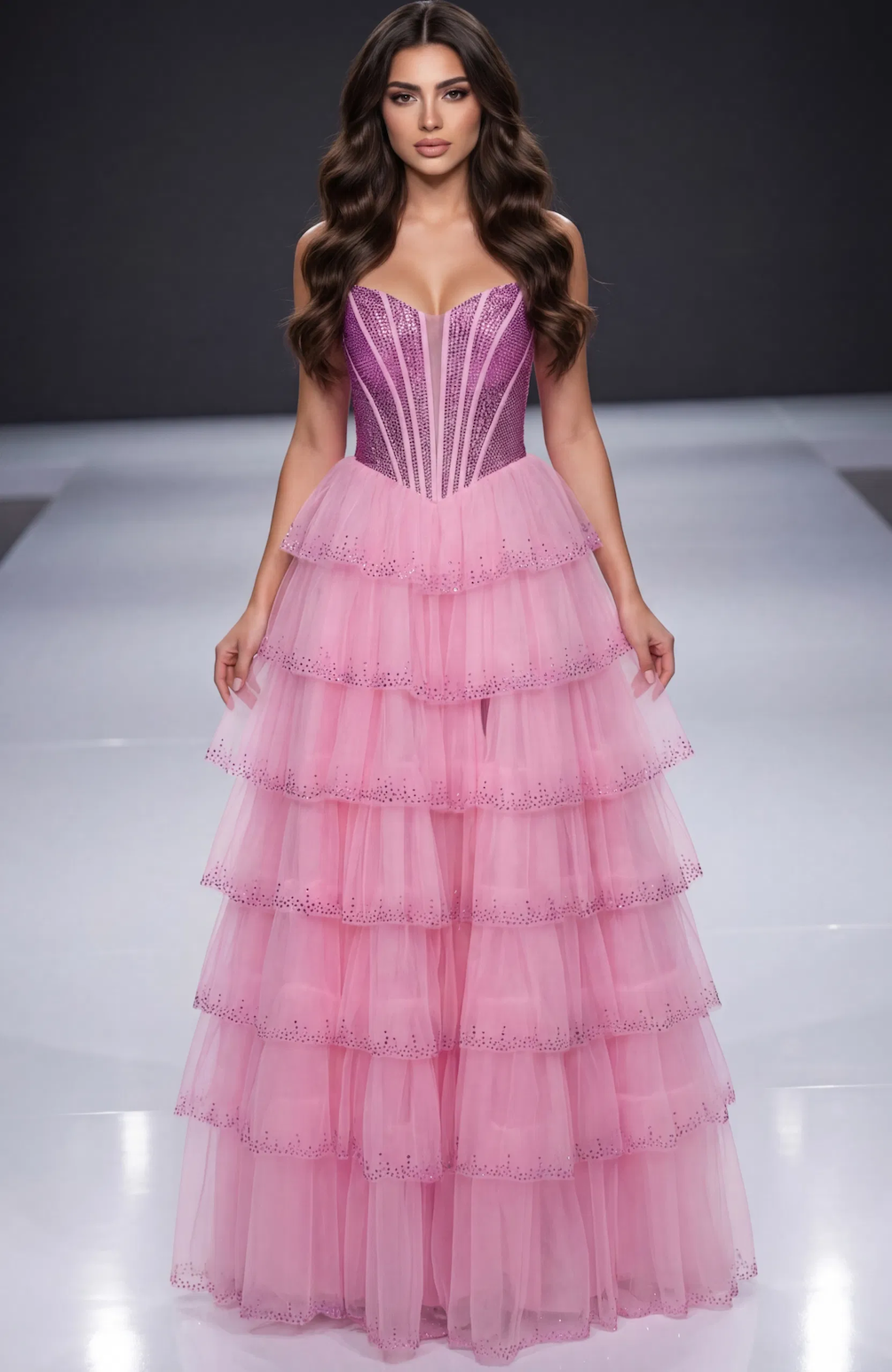 This dress features a strapless neckline with an illusion plunge, a bodice with corset boning and hot fix stones, a layered tiered skirt with sparkle detail on the hemline and a lace-up back. A stand-out choice for your next prom or formal event.