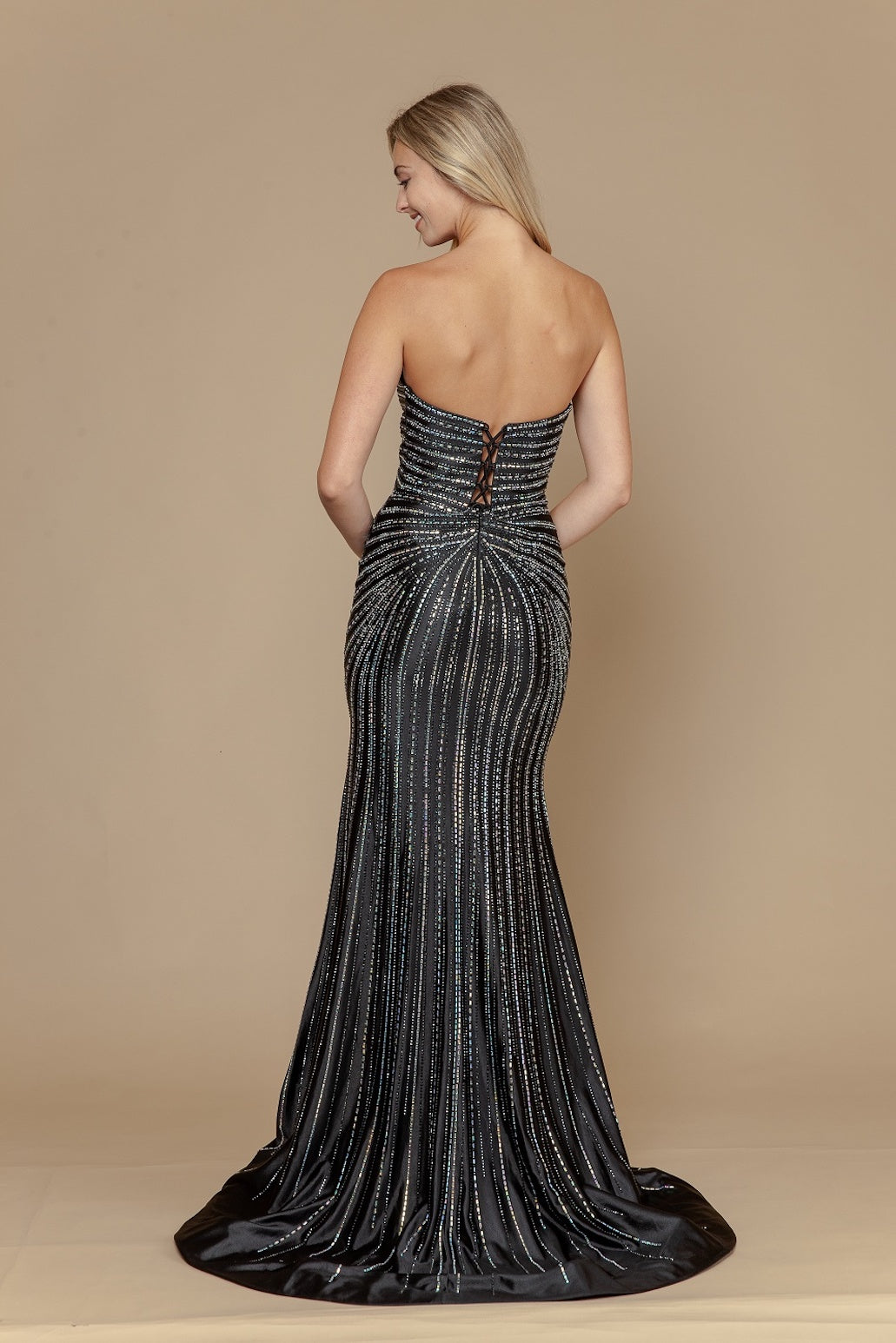 This dress features a strapless sweetheart neckline, a keyhole below the bust, a lace-up back and a fitted silhouette. The fabric is adorned with hot fix stones creating a unique pattern. A beautiful gown for your next prom or formal event.