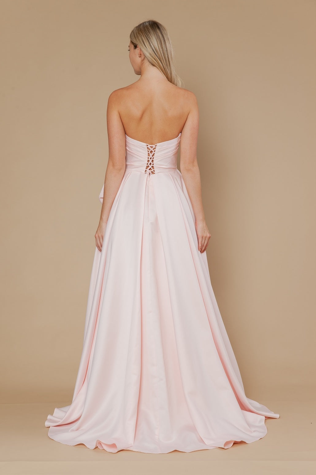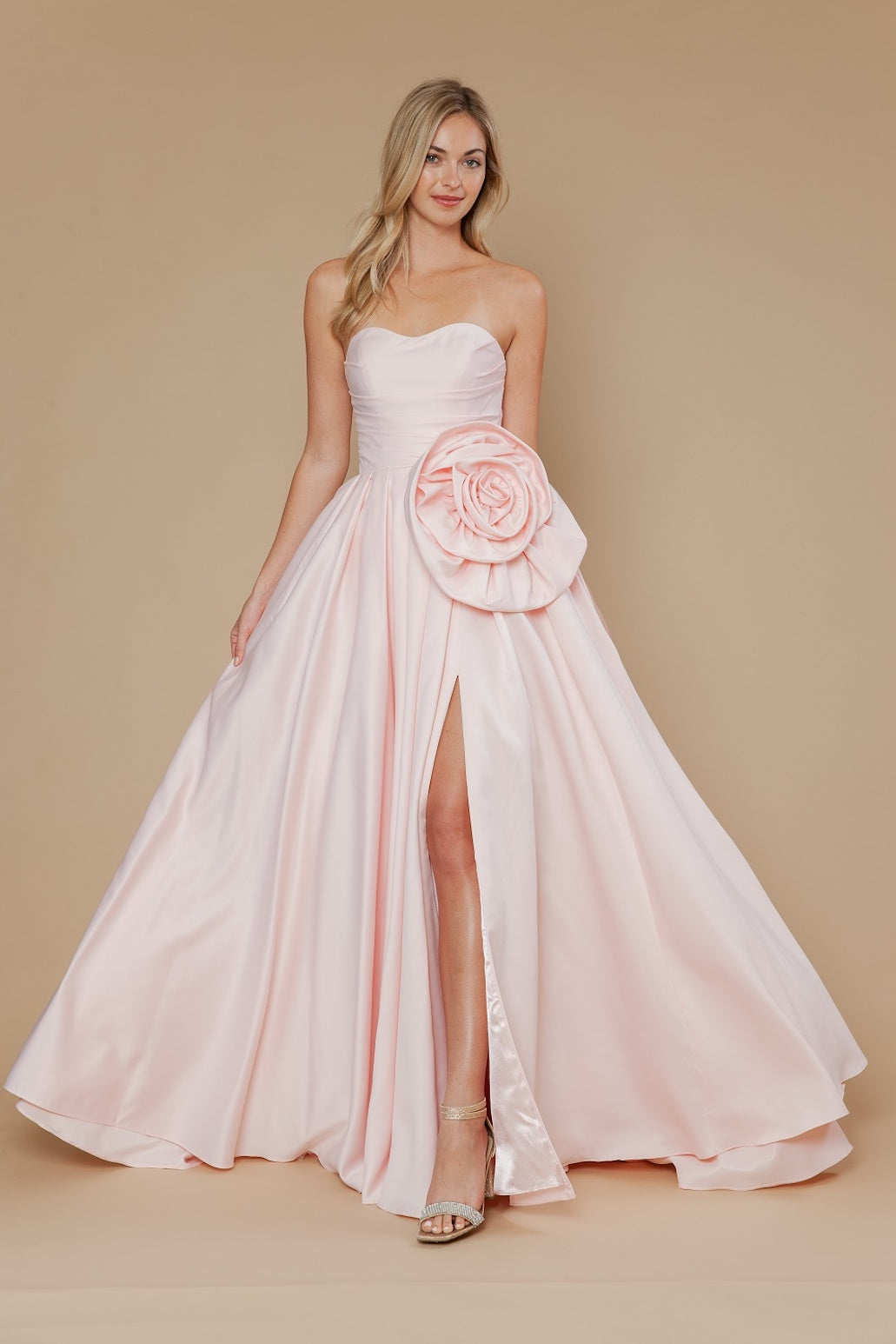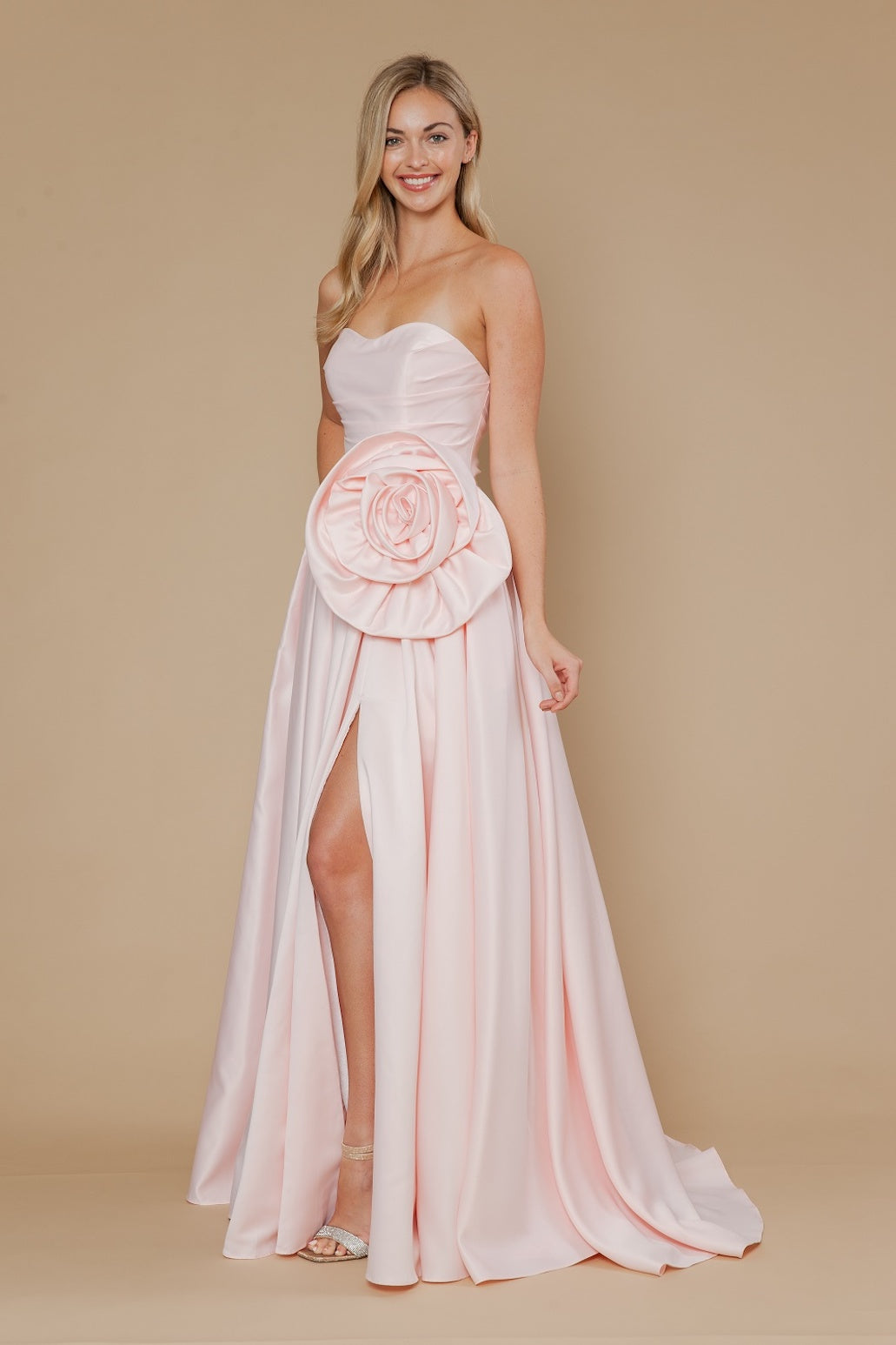 This dress features a strapless sweetheart neckline with a 3D flower on the hip. The A-line silhouette with the skirt slit completes this gorgeous design. An ideal choice for your next prom or formal event.