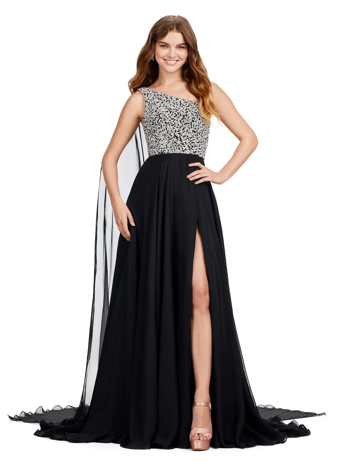 This gown features a fully beaded one-shoulder bodice with a flowy, A-line chiffon skirt. The left leg slit and one shoulder cape make for a show-stopping look! A stunning choice for your next pageant or formal event.