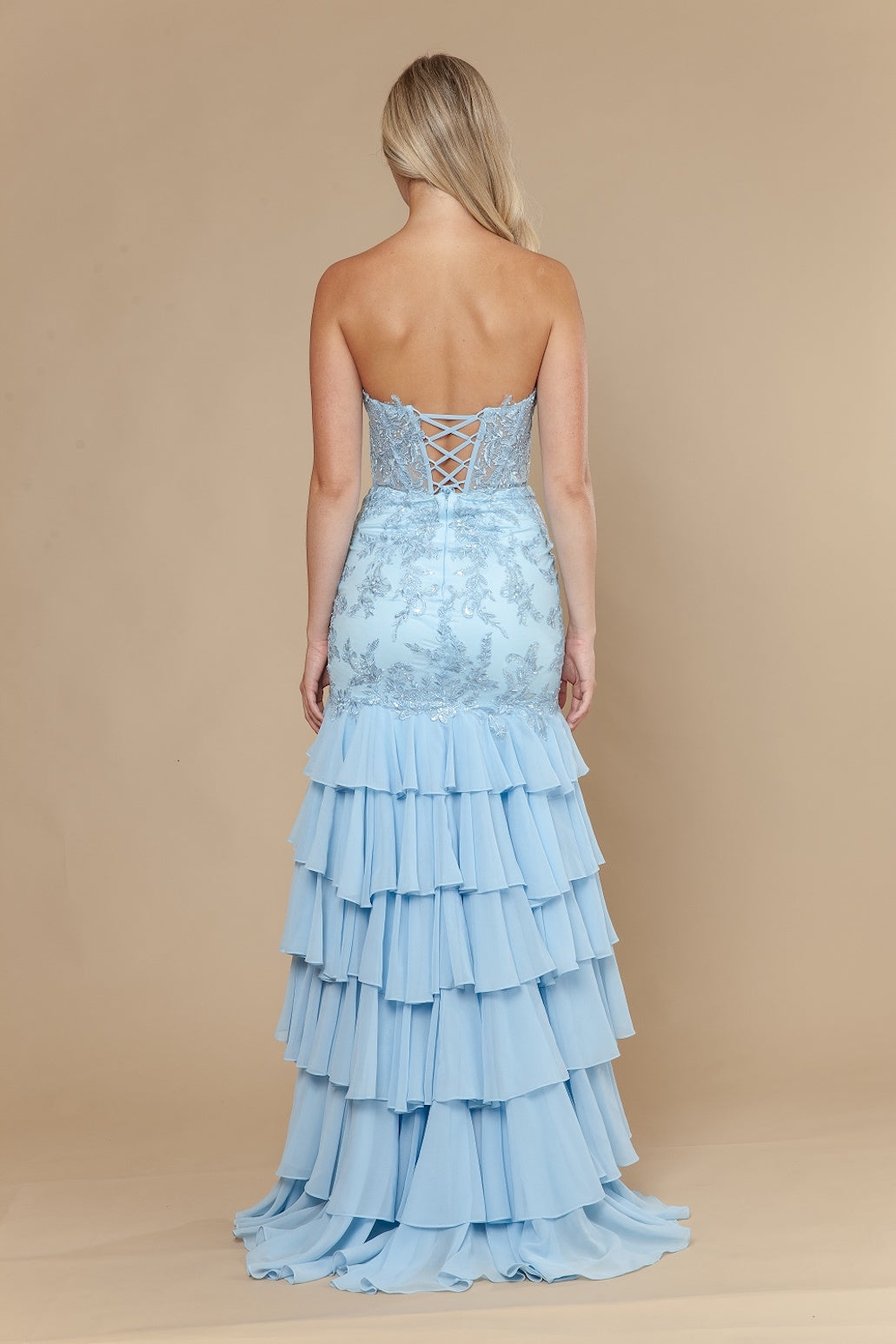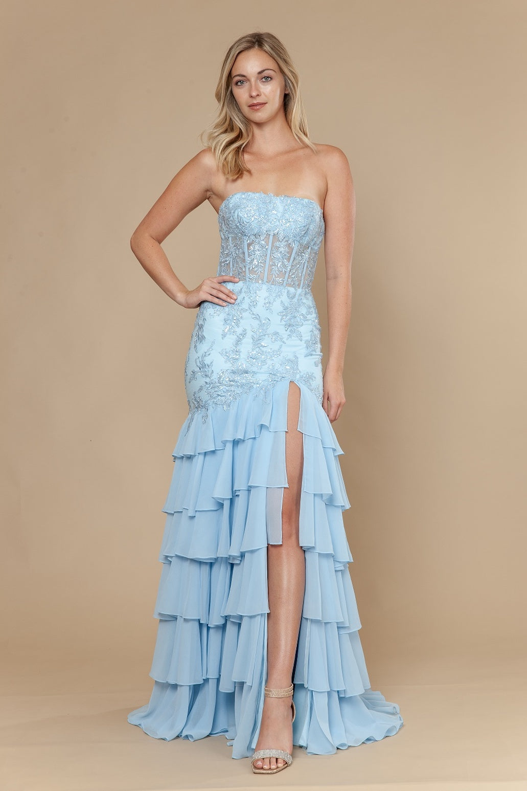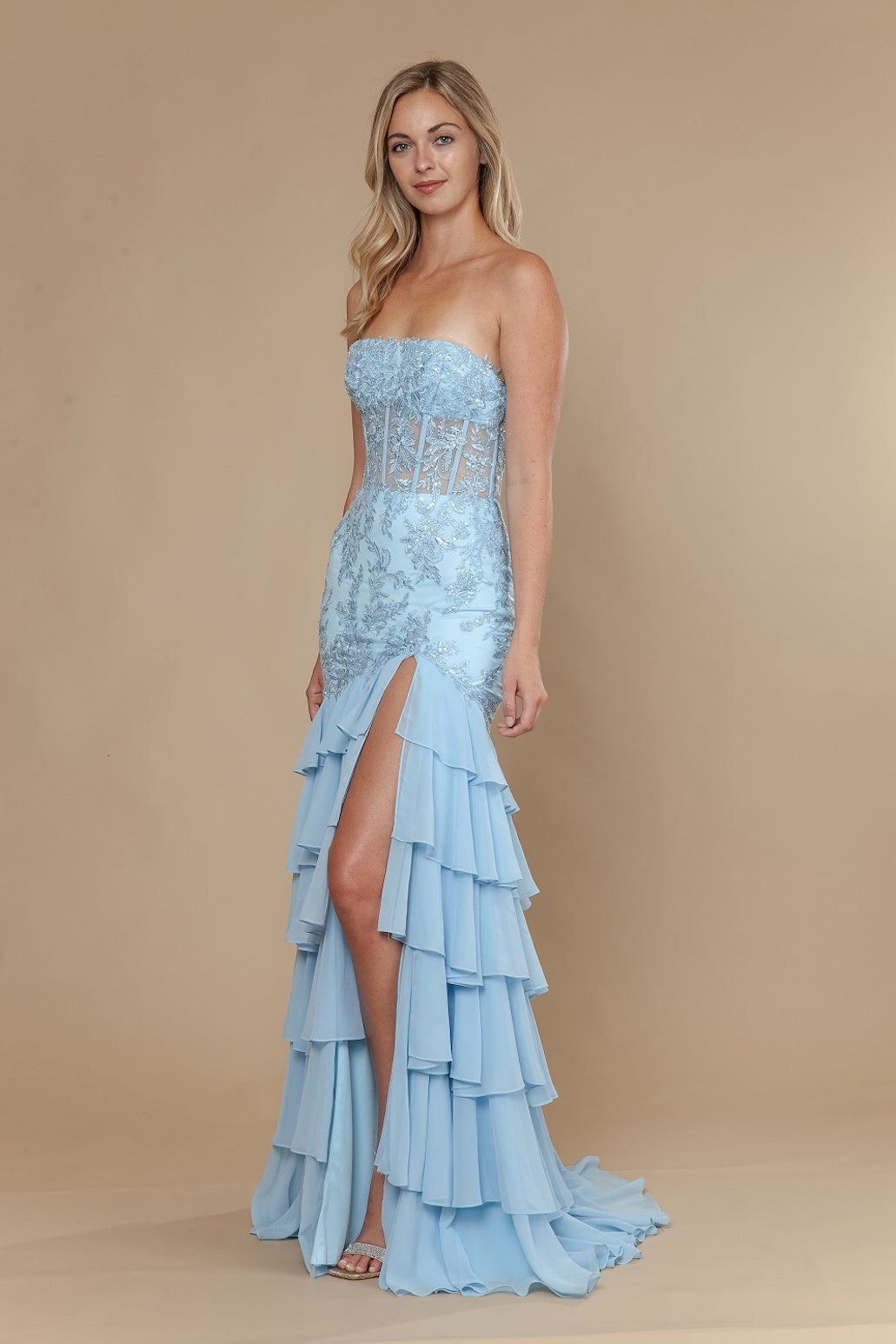 This dress features a strapless neckline, a sheer lace bodice with corset boning, a lace-up back and a tiered ruffle skirt. Style this dress to make it your own at your next prom or formal event.