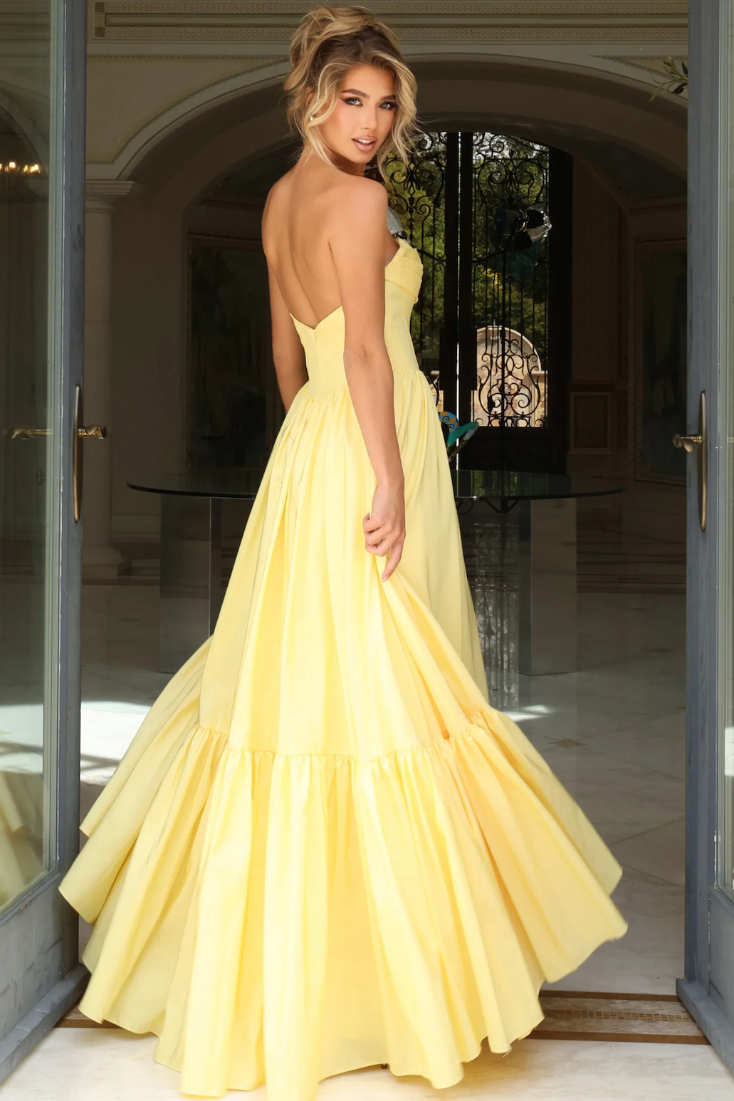 This dress features a strapless sweetheart neckline, with a corset-style bodice with a ruffle detail on the skirt. A stunning choice for your next prom or formal event.
