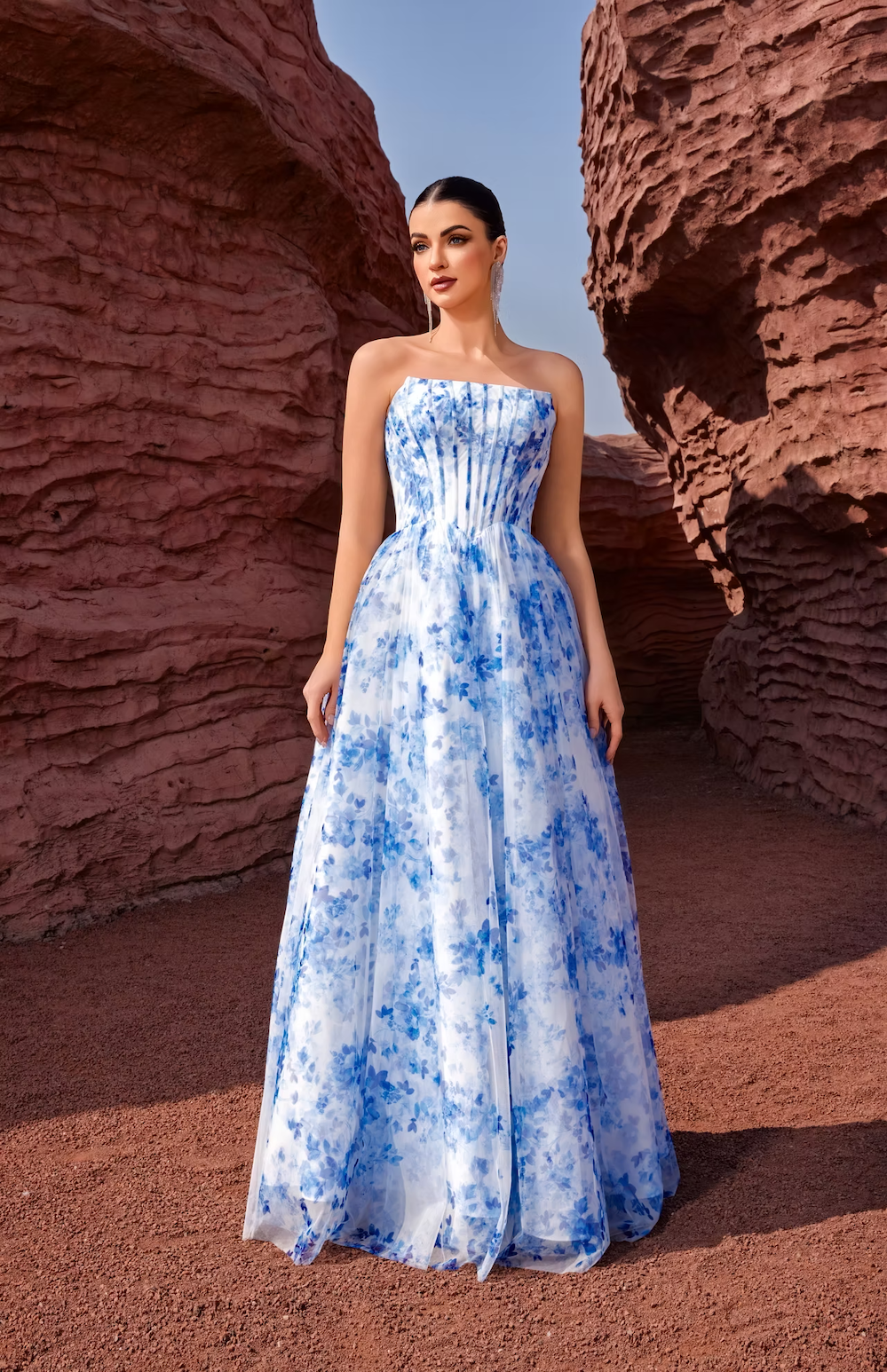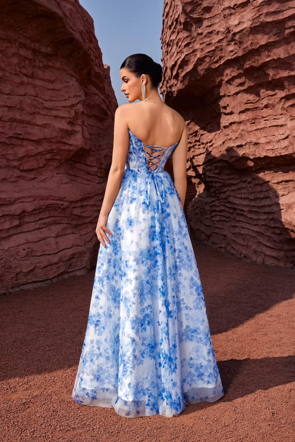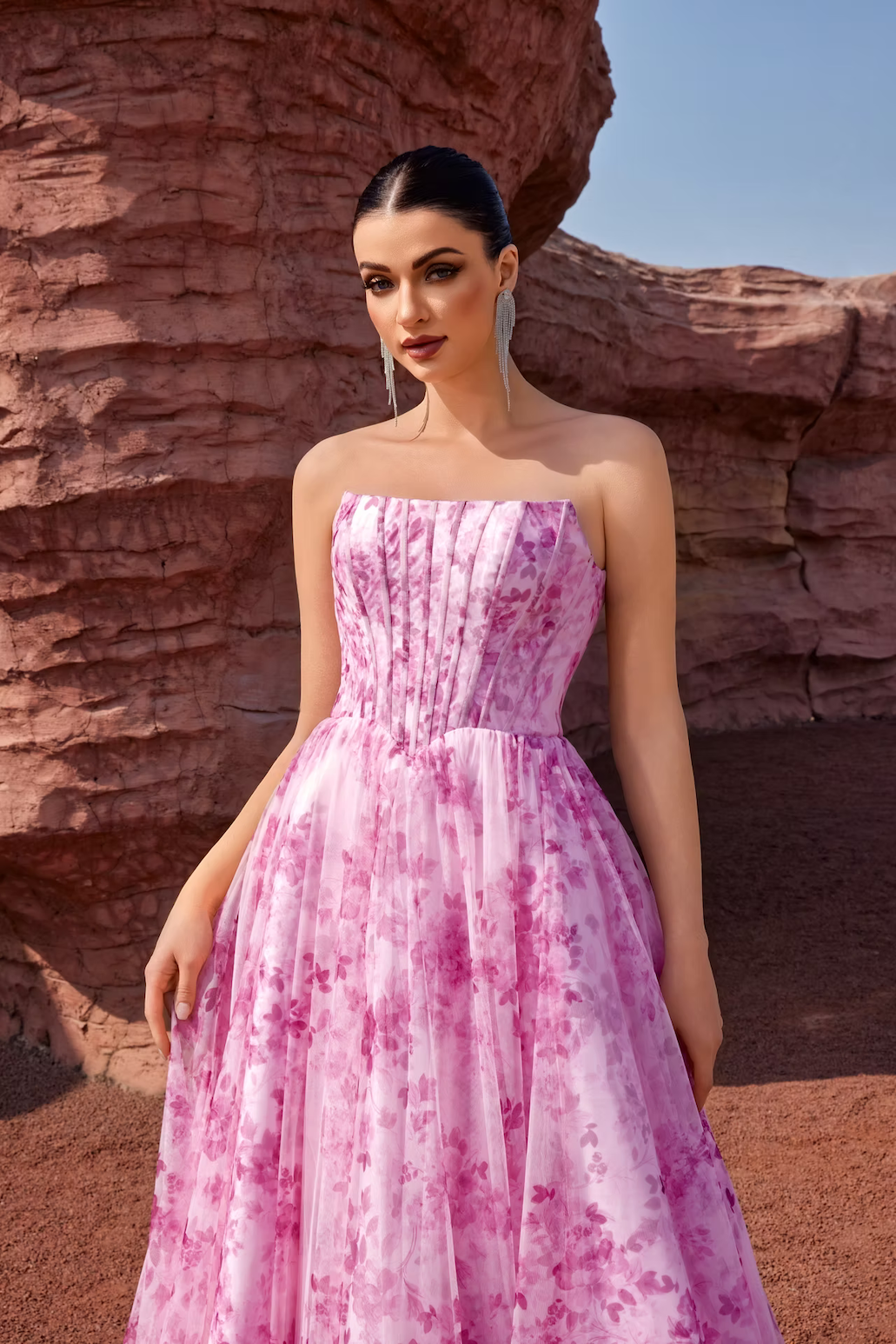 This dress features a strapless neckline, a bodice with corset boning, a lace-up back, floral print fabric and an A-line silhouette. An effortless choice for your next prom or formal event.