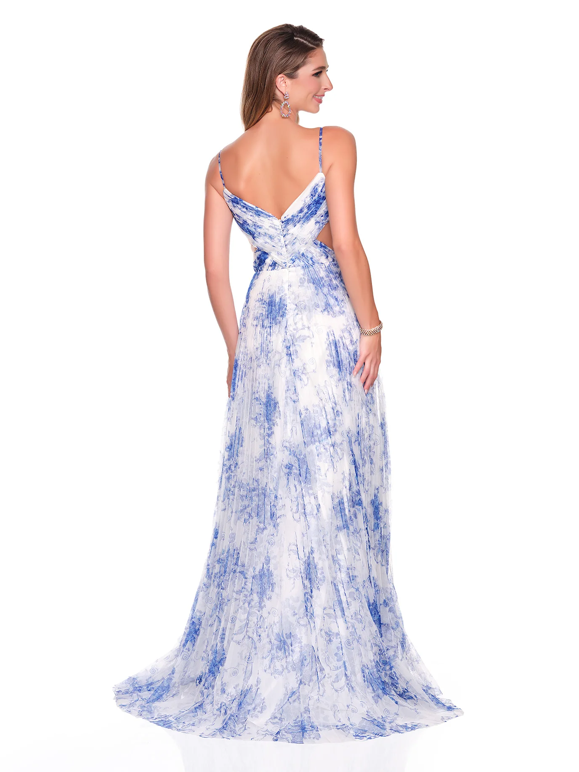 This dress features a floral print fabric, a V-neckline with spaghetti straps, a criss-cross bodice with illusion cut-outs, ruched fabric, and a flowy pleated skirt. A one-of-a-kind gown for your next prom or formal event.