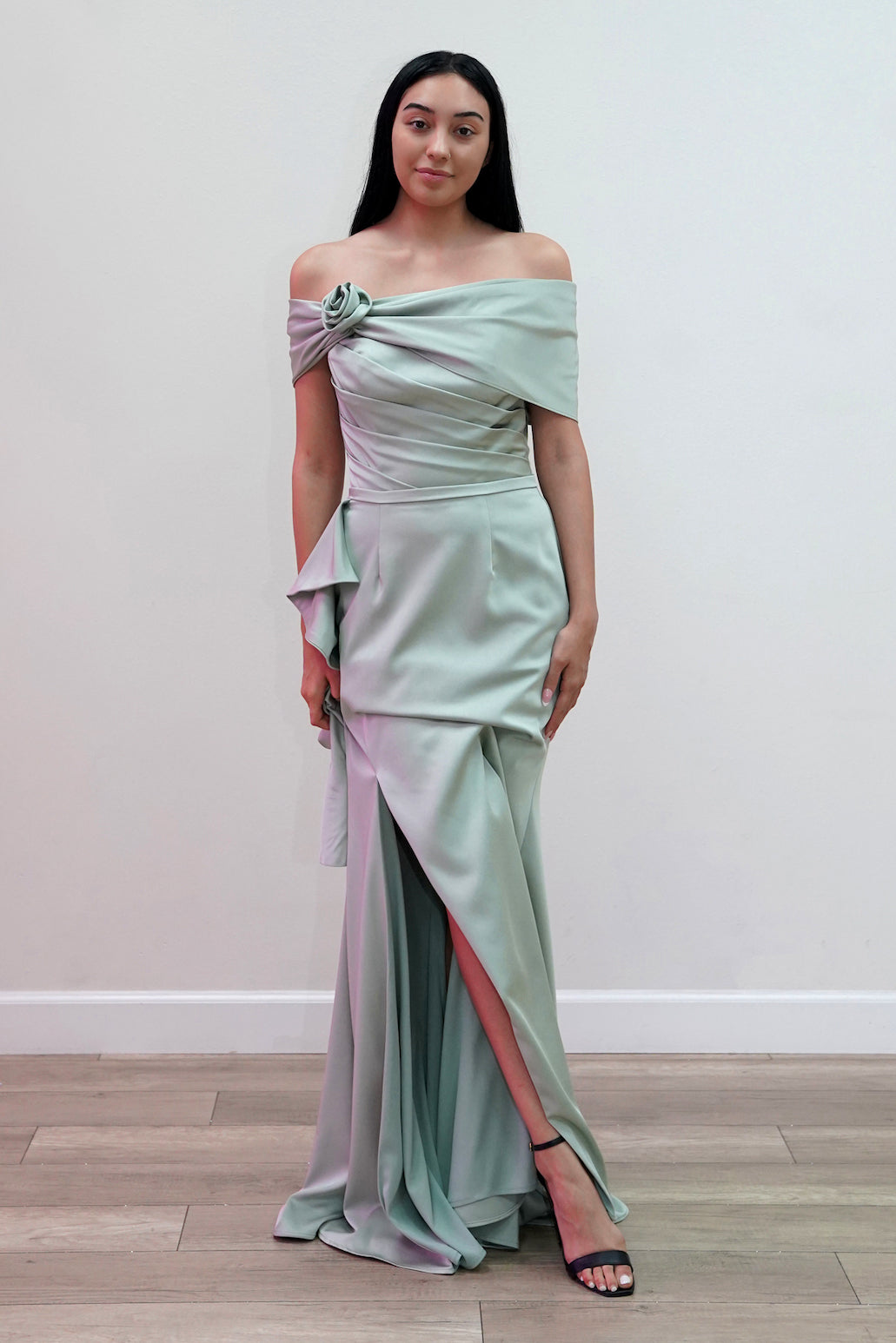 This dress features an off-the-shoulder neckline with a rose detail, cascading fabric off the hip and a skirt slit. A gorgeous gown for your next social occasion or formal event.