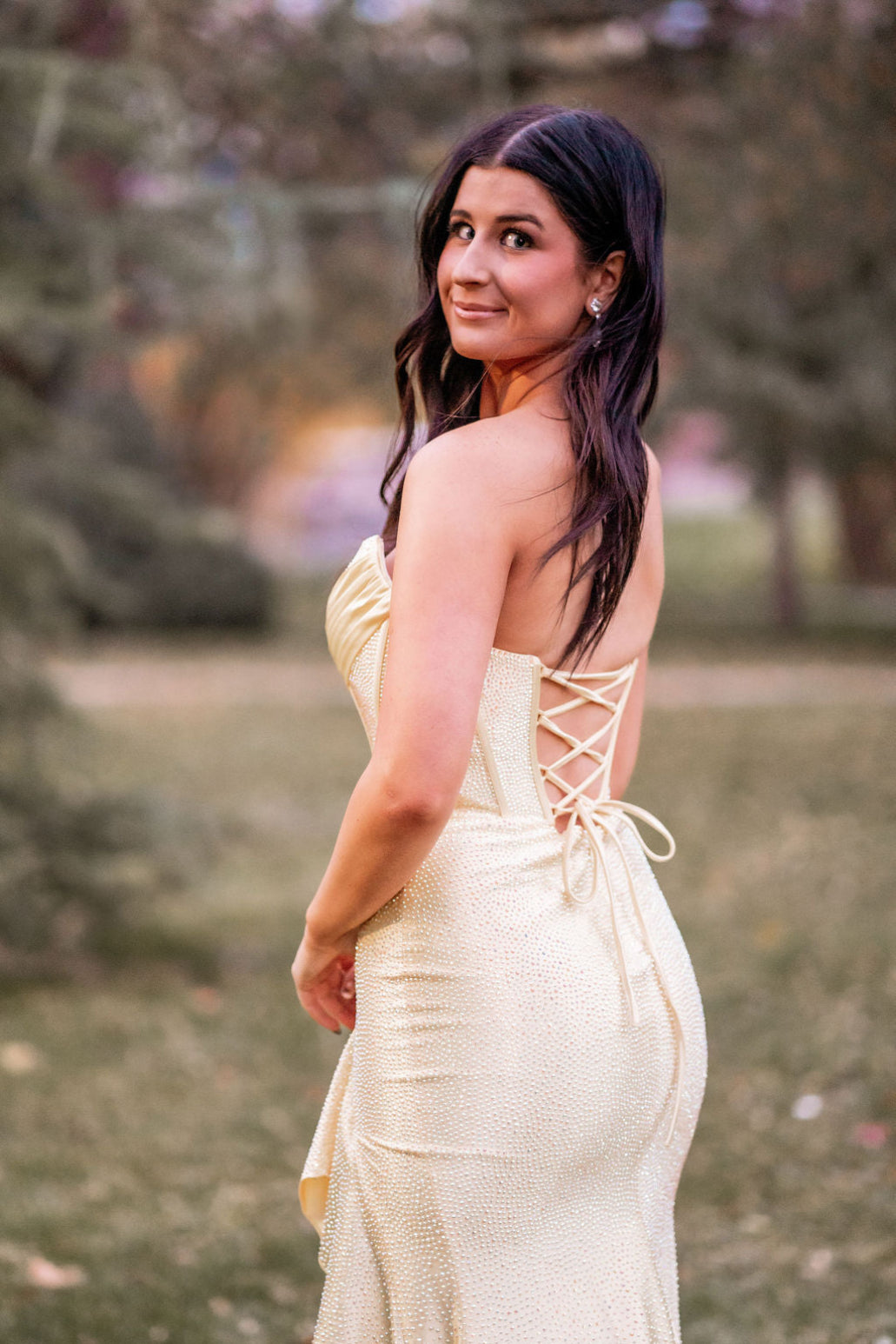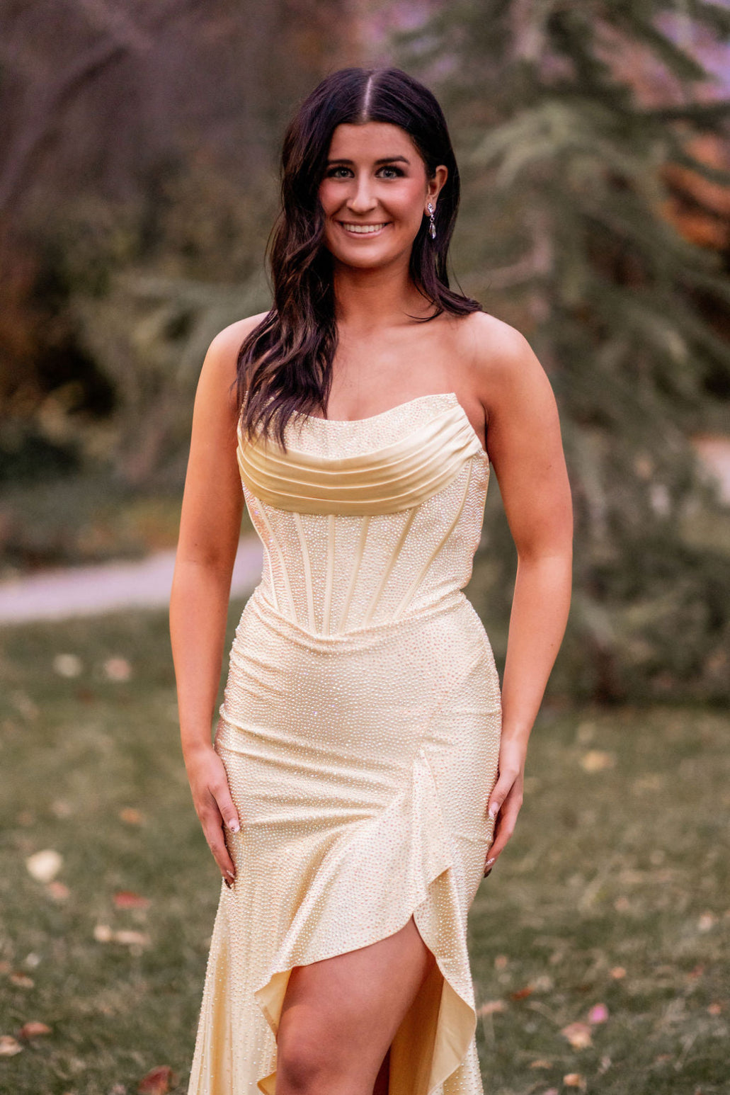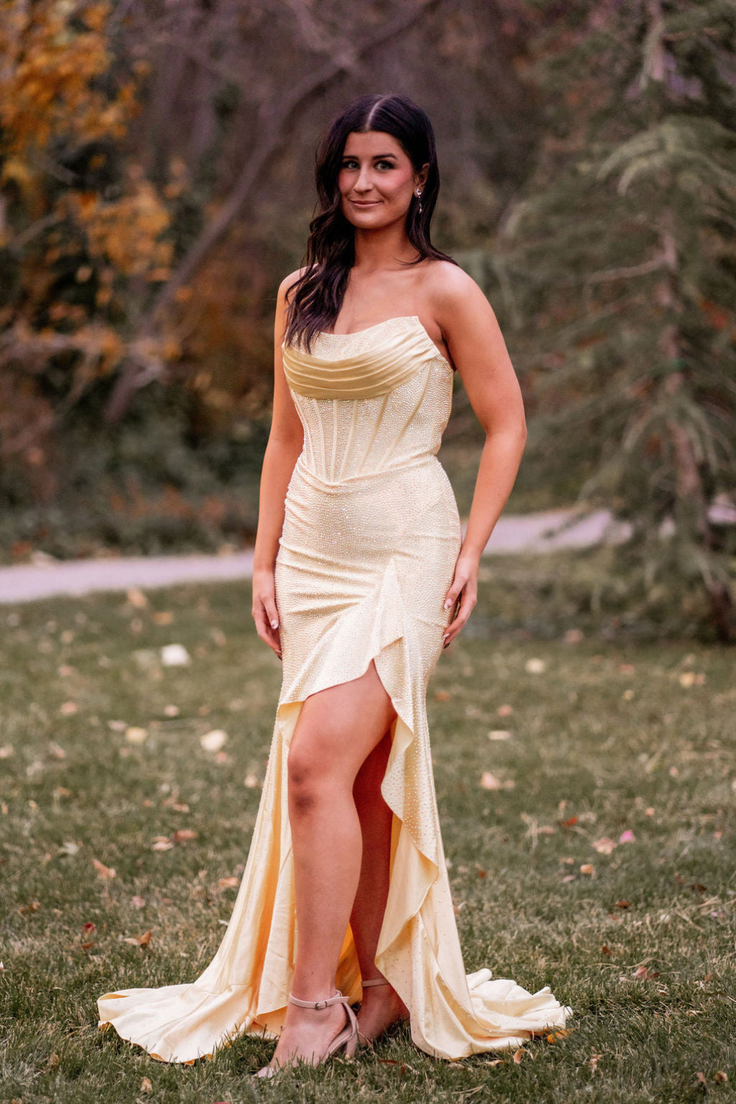 This Sherri Hill gown features a strapless neckline, hot pressed stoning, with a corset bodice, ruffled skirt with slit, and a lace up back. Add a pair of statement earrings for the perfect prom or formal event look.