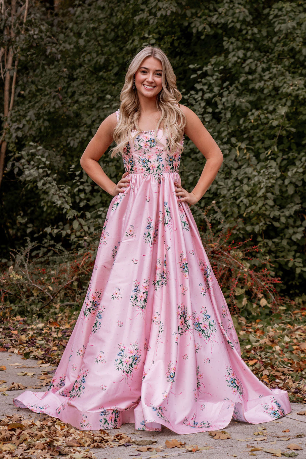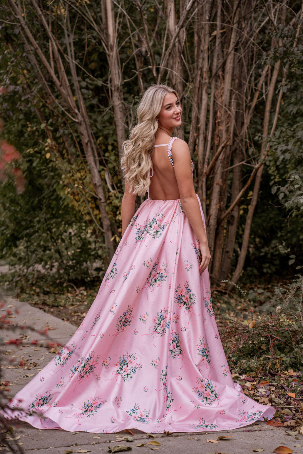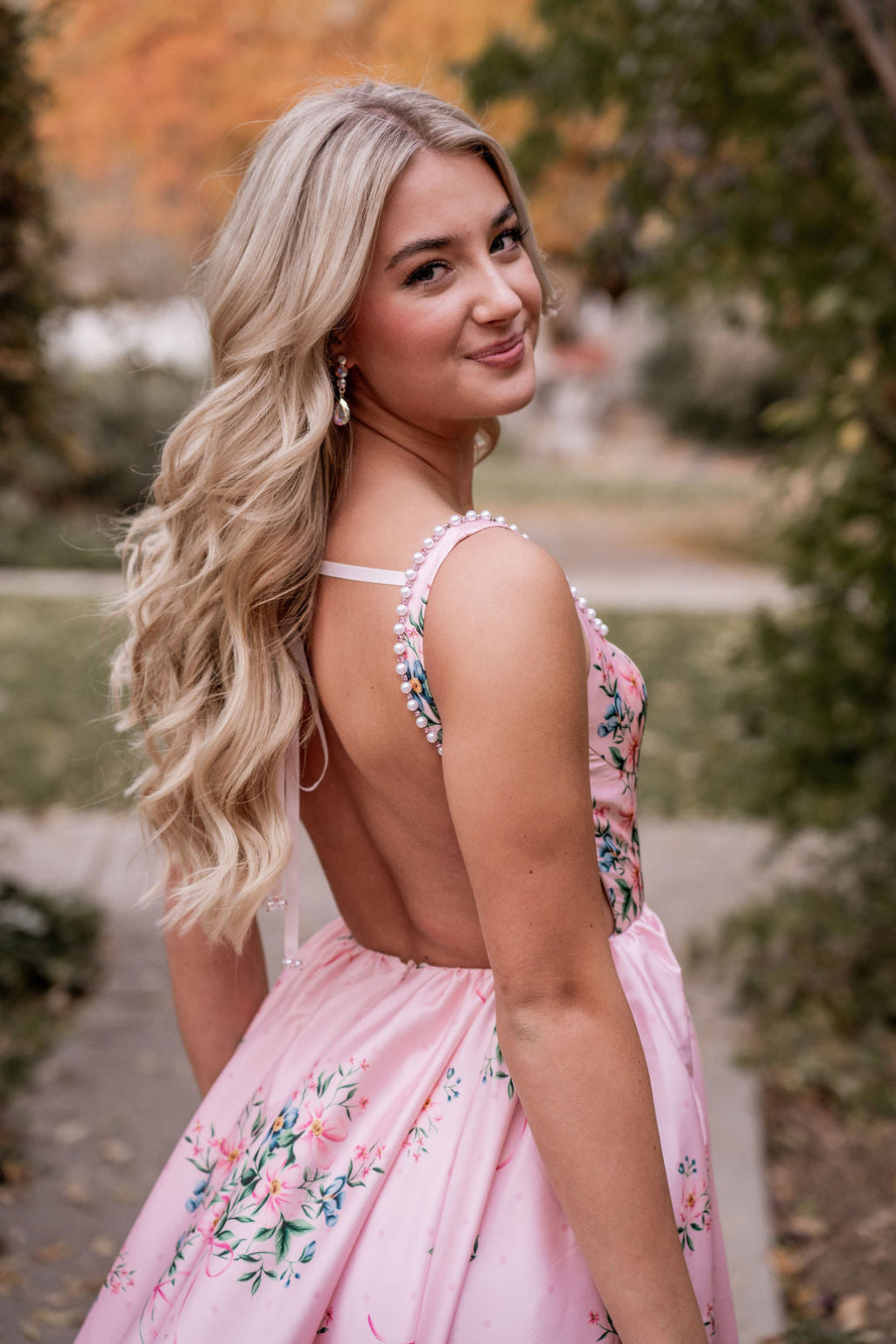 This dress features a square neckline with 1-inch pearl embellished straps, an open back, floral print fabric and an A-line silhouette. Could this be your dream prom dress?