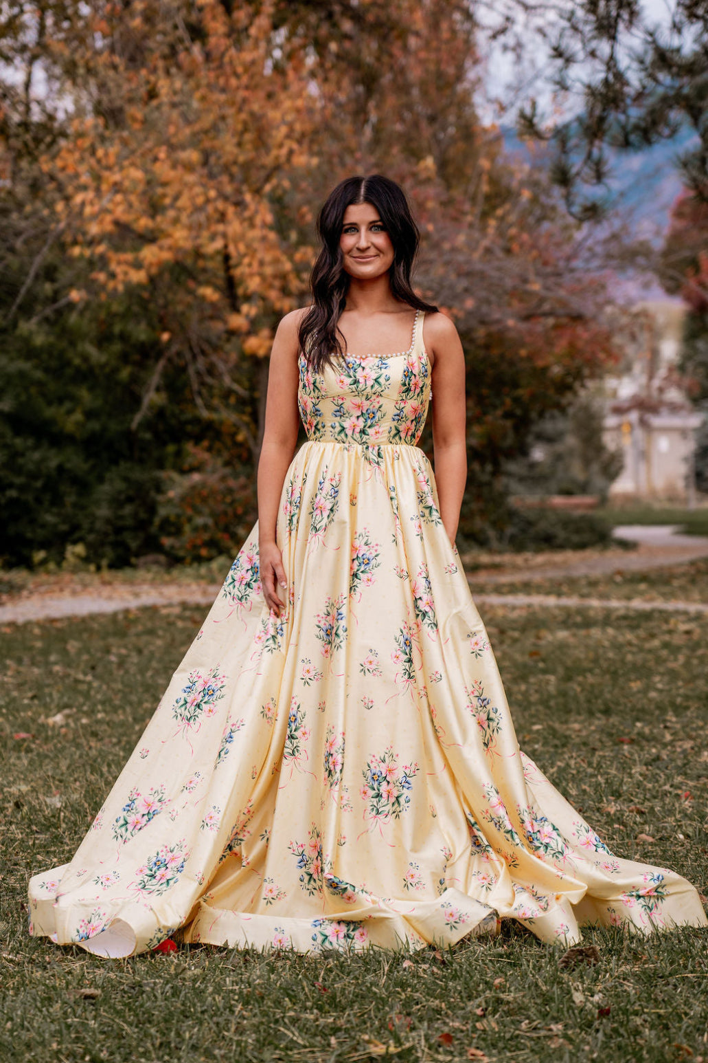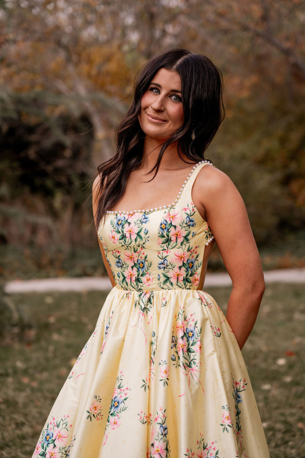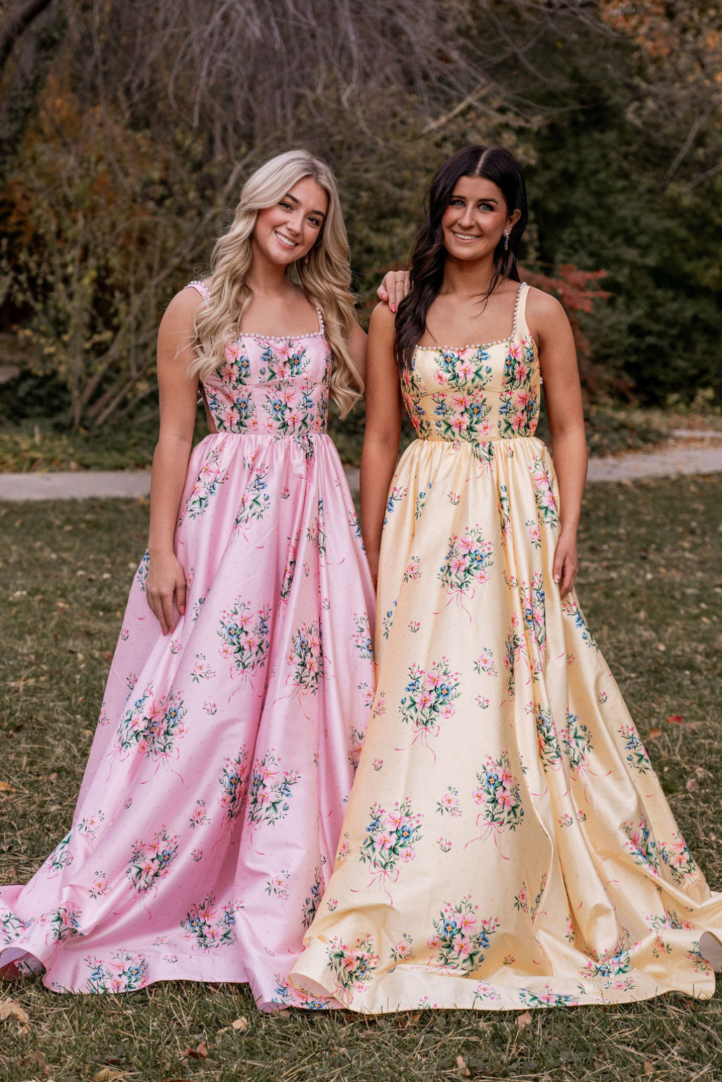 This dress features a square neckline with 1-inch pearl embellished straps, an open back, floral print fabric and an A-line silhouette. Could this be your dream prom dress?