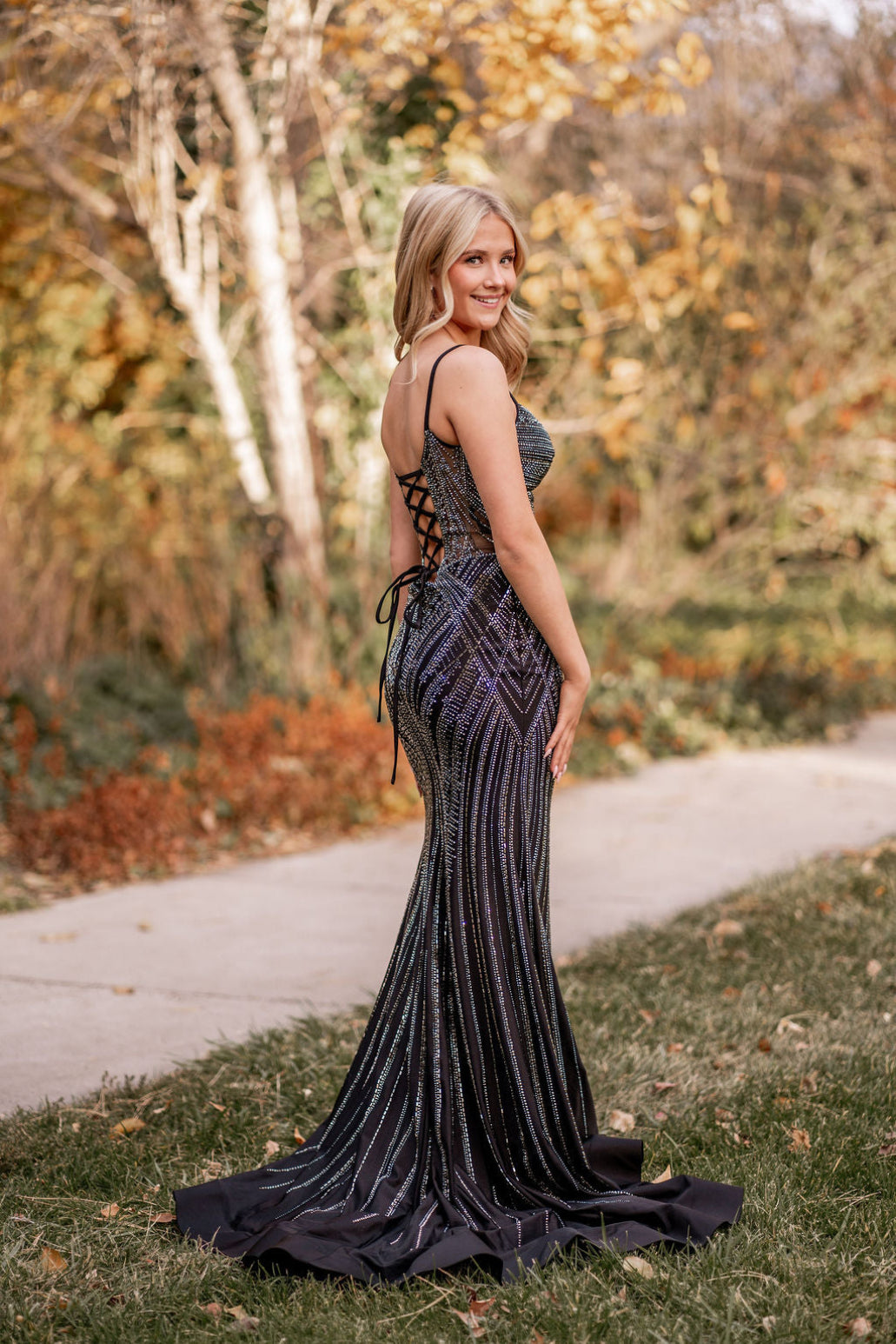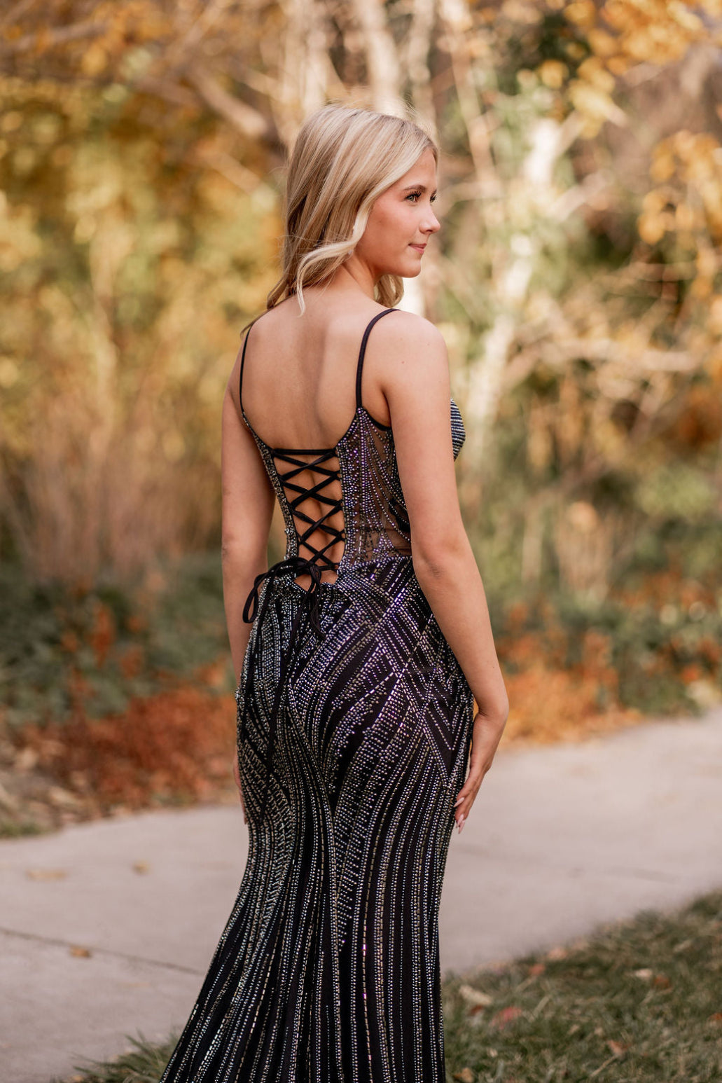 This dress features a fitted silhouette with hot fix stones, a corset bodice and a skirt slit. A glamorous choice for your next prom or formal event.