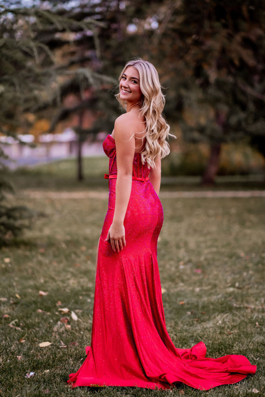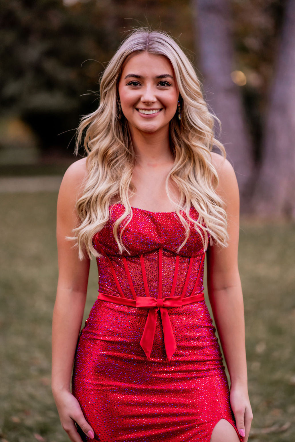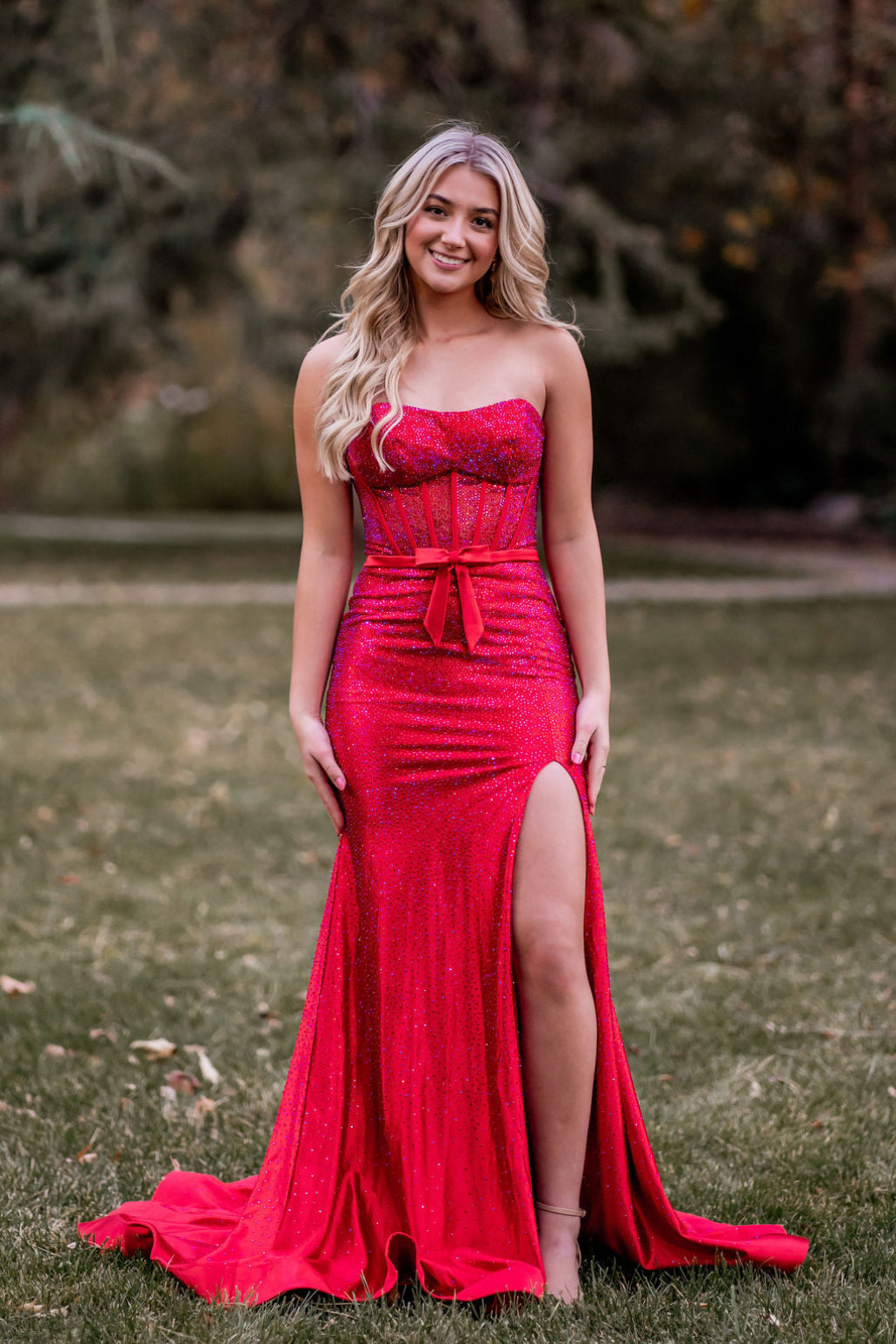 This dress features a strapless neckline, a fitted silhouette with hot fix stones, a corset bodice, a skirt slit, and a bow. An ideal choice for your next prom or formal event.