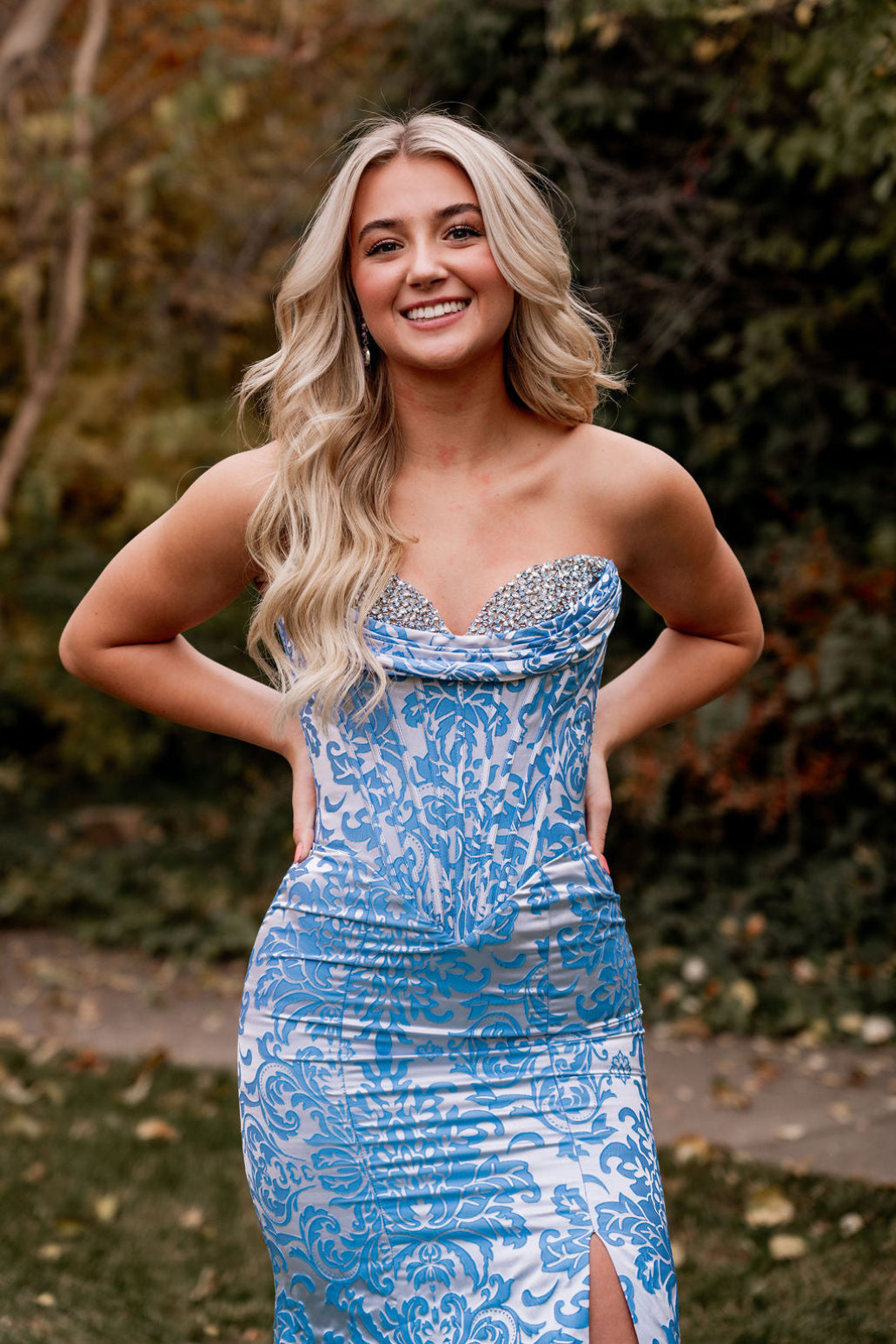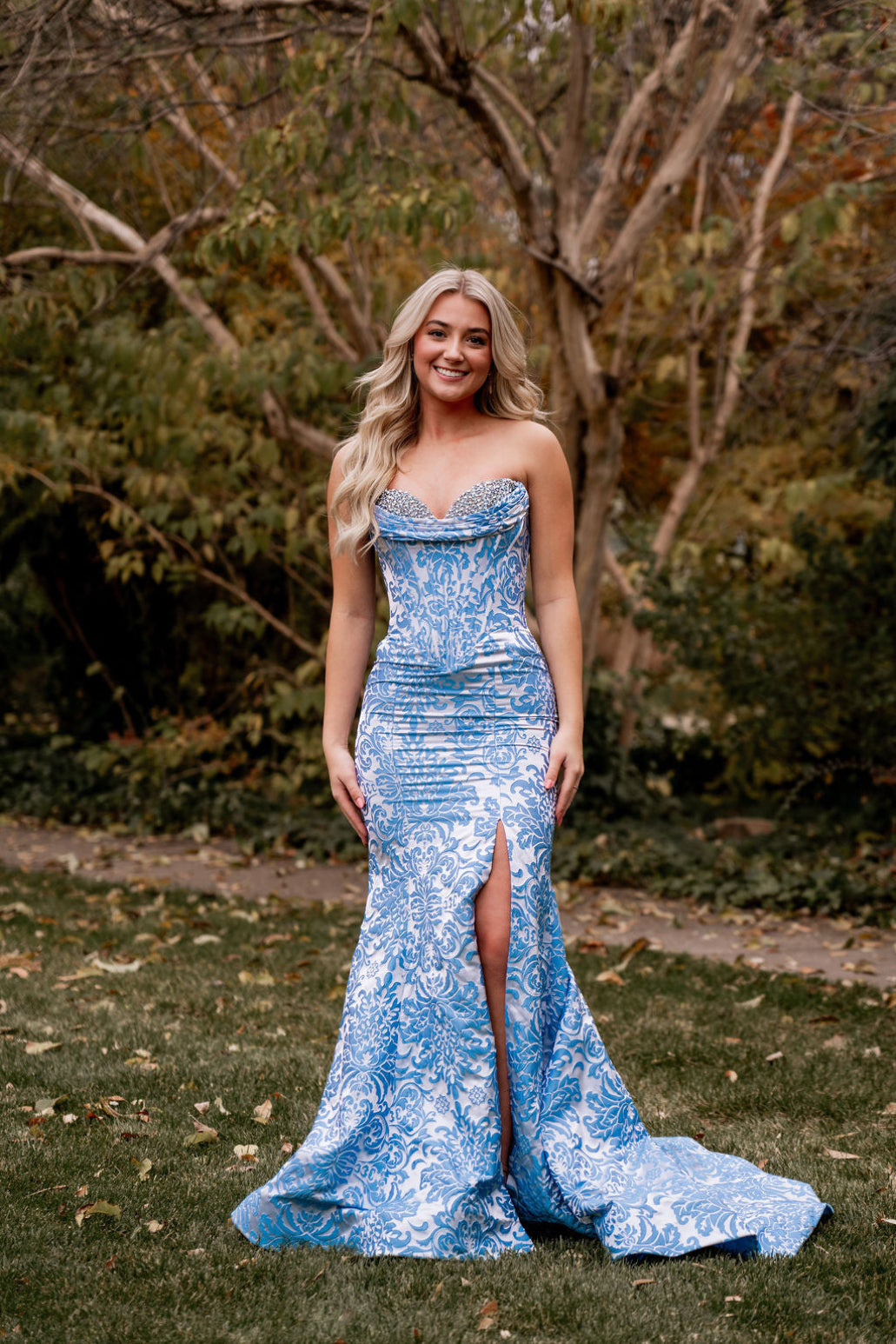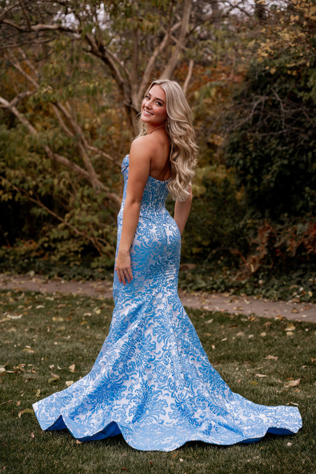 This dress features a strapless neckline with a fitted silhouette, brocade fabric with a skirt slit and bead embellishments. An ideal choice for a prom or formal event.