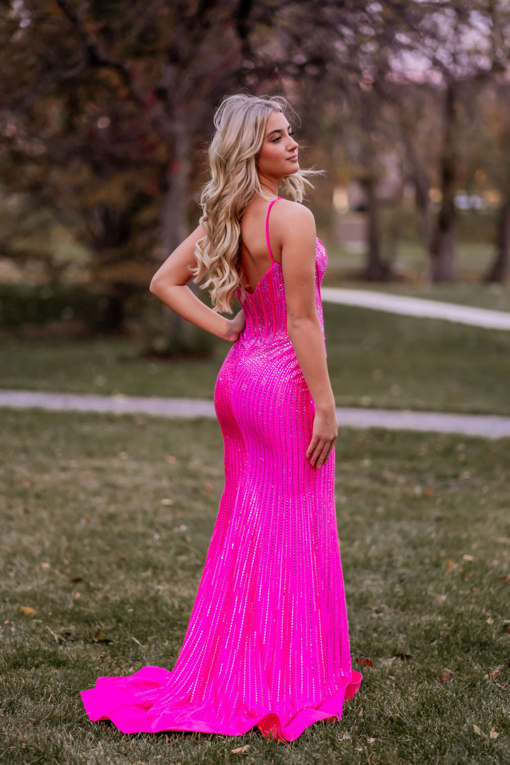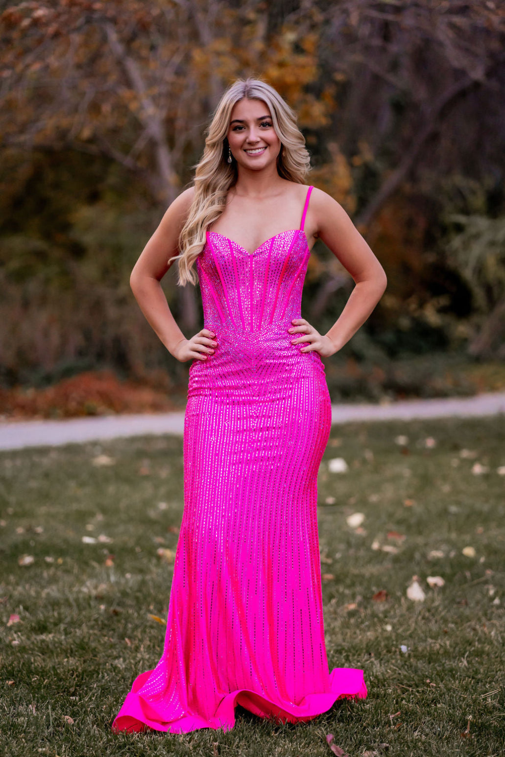 This dress features a fitted silhouette with a corset bodice and spaghetti straps, and hot fix stones intricately designed throughout the fabric. This is a stand out choice for your next prom or formal event.