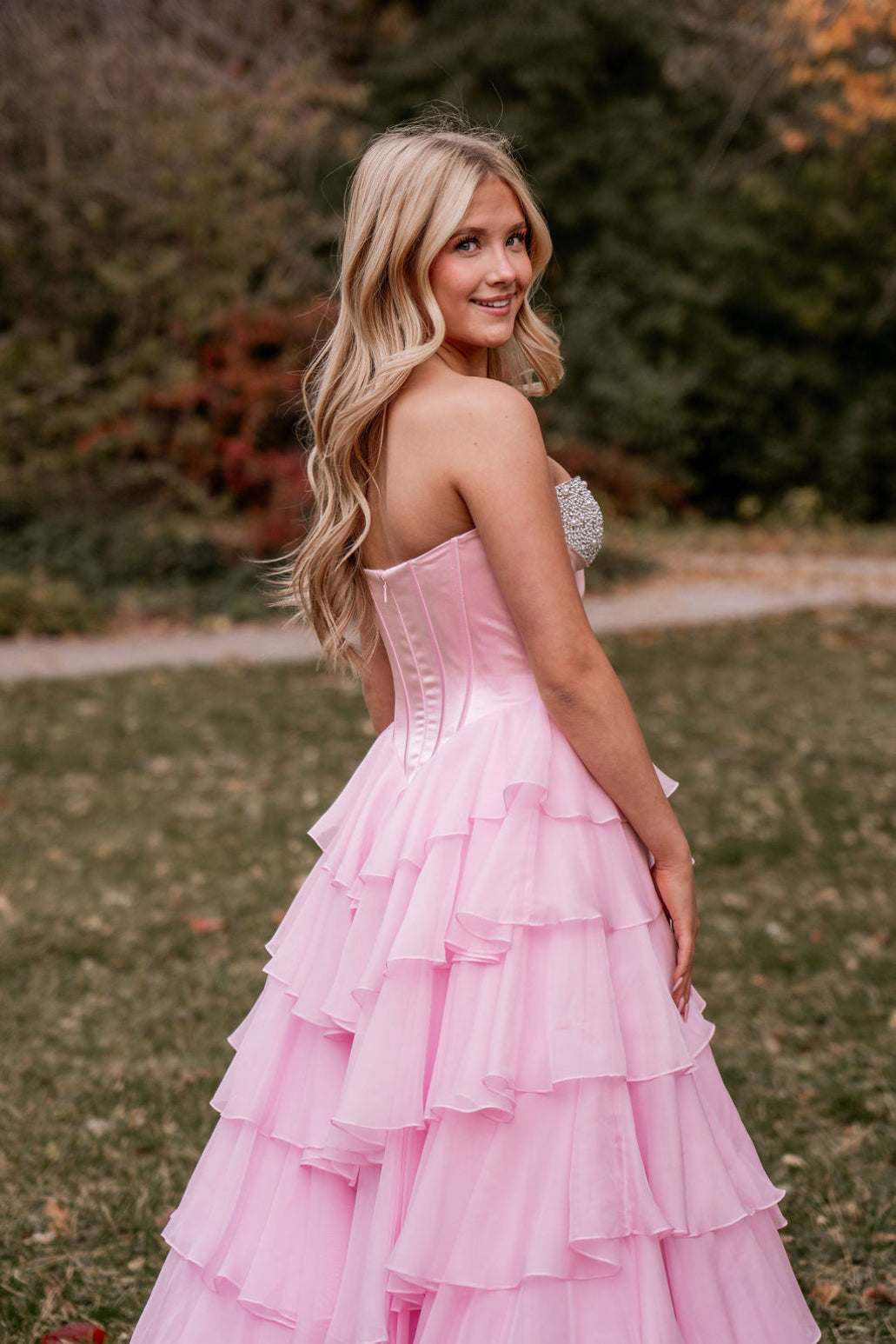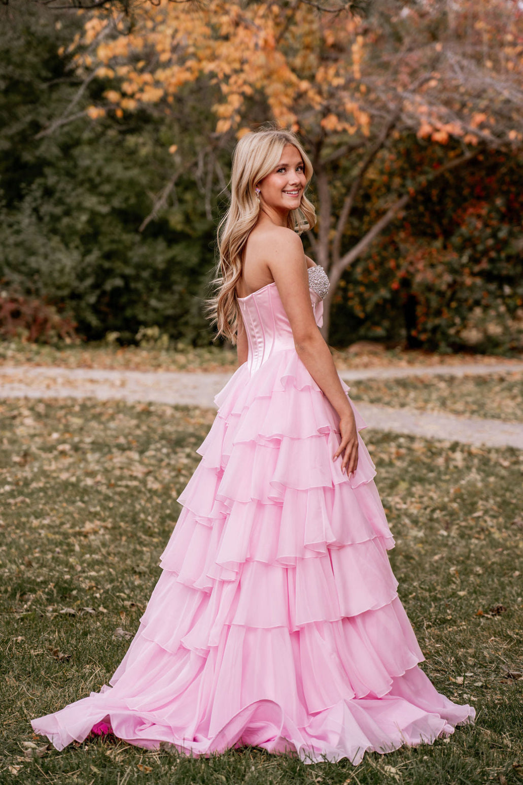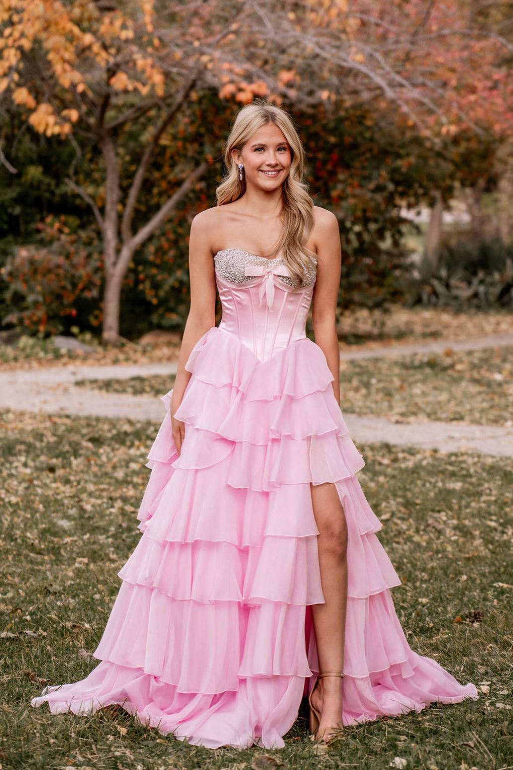 This dress features a strapless neckline with a corset bodice, pearl and bead embellishments, and a chiffon ruffle skirt with a slit. A stunning choice for your next prom or formal event.