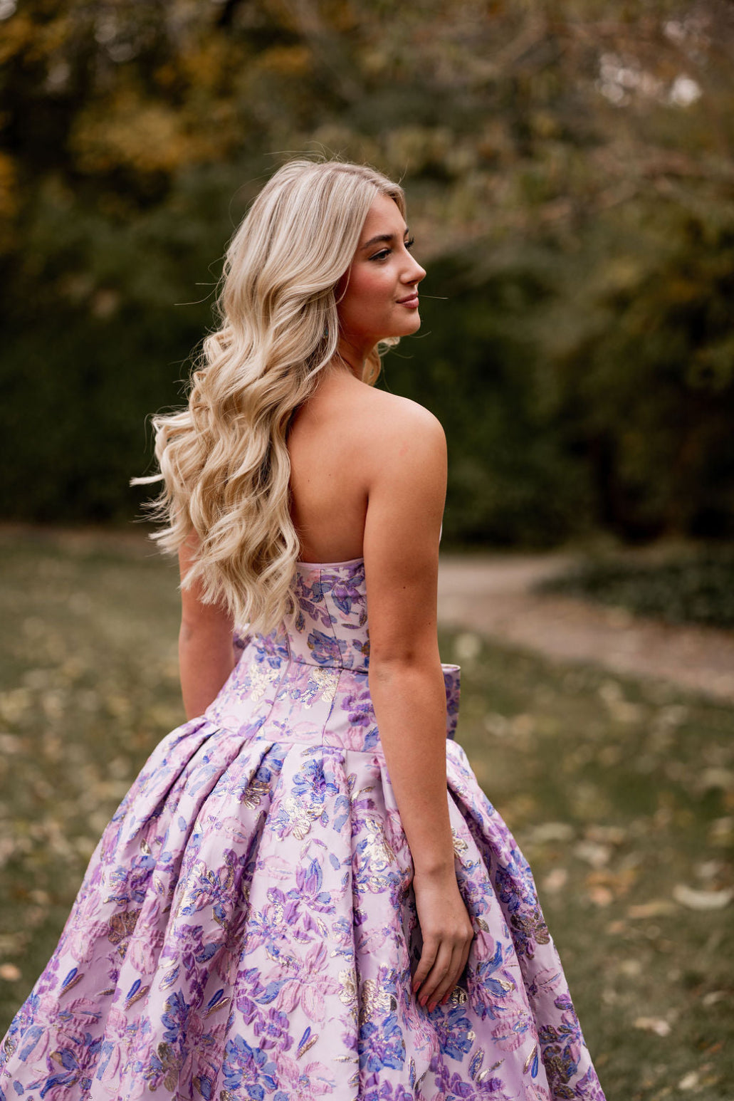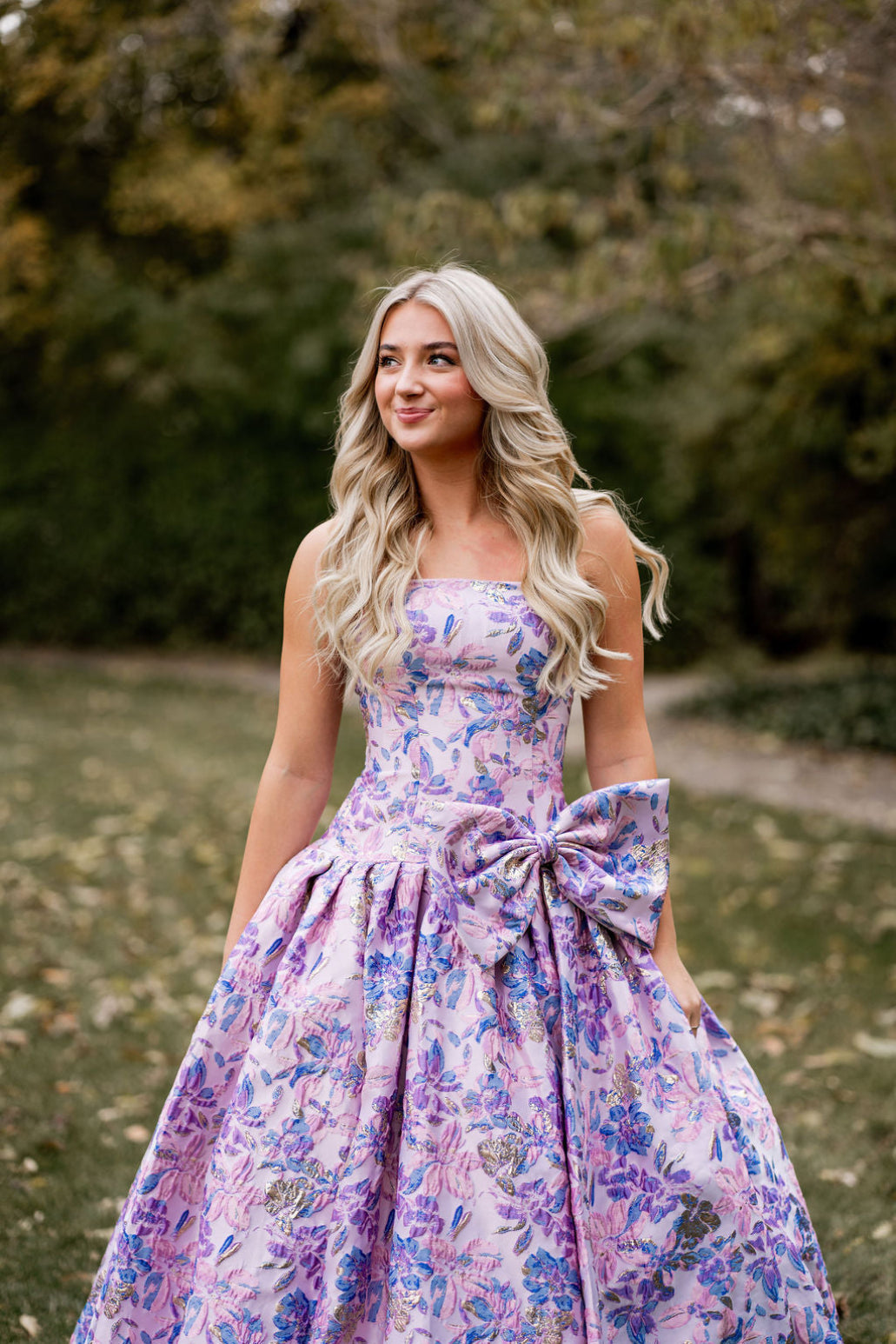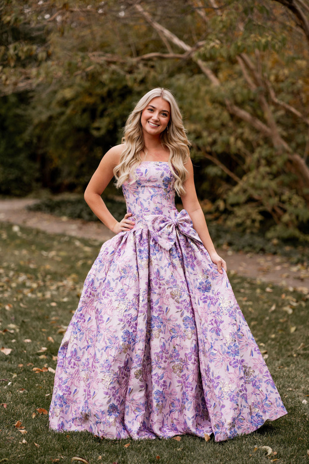 This gown features a strapless neckline with a drop-waist, brocade fabric with a dramatic bow on the hip. Stun at your next prom or formal event in this gorgeous ballgown.