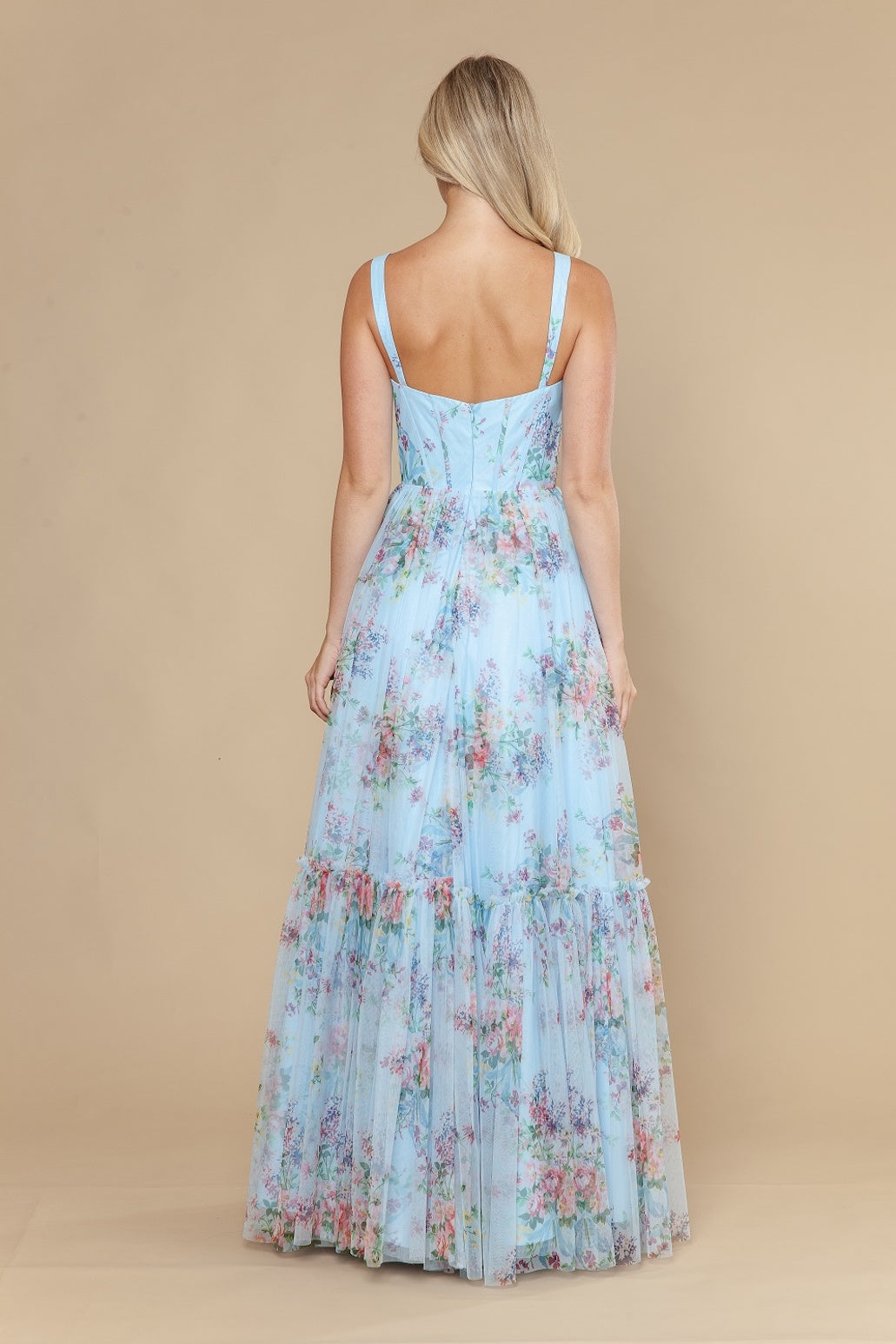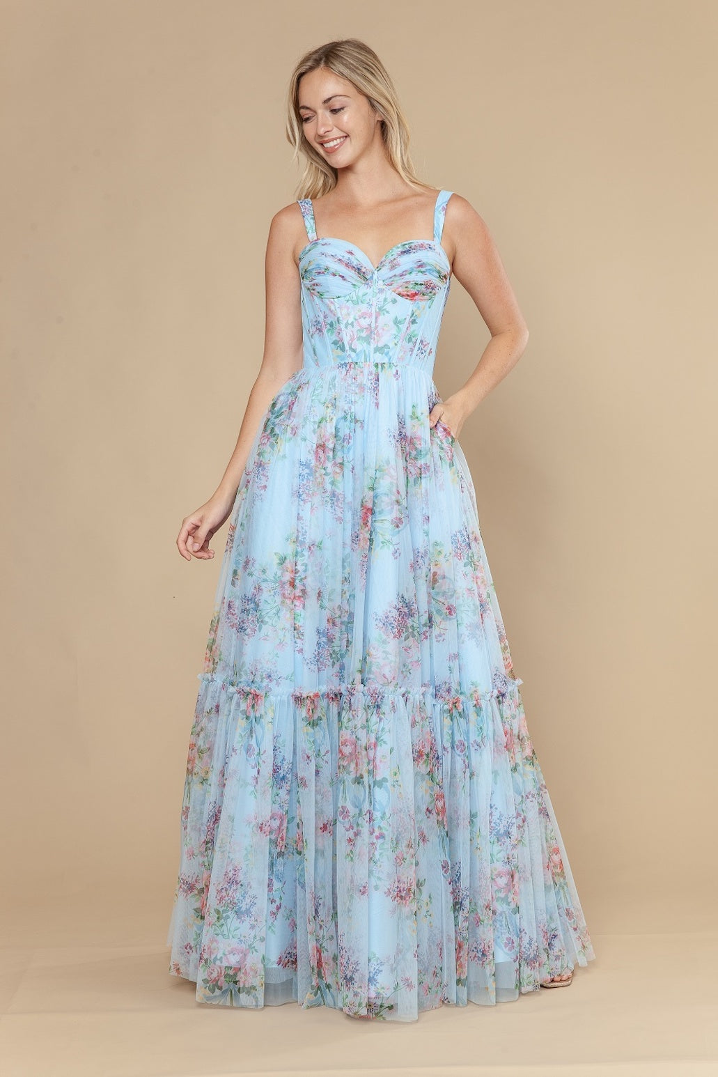 This dress features a sweetheart neckline, 1-inch straps, a bodice with corset boning, and a floral print fabric with an A-line silhouette. A romantic choice for your next prom or formal event.