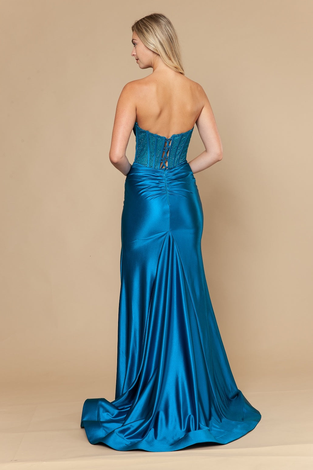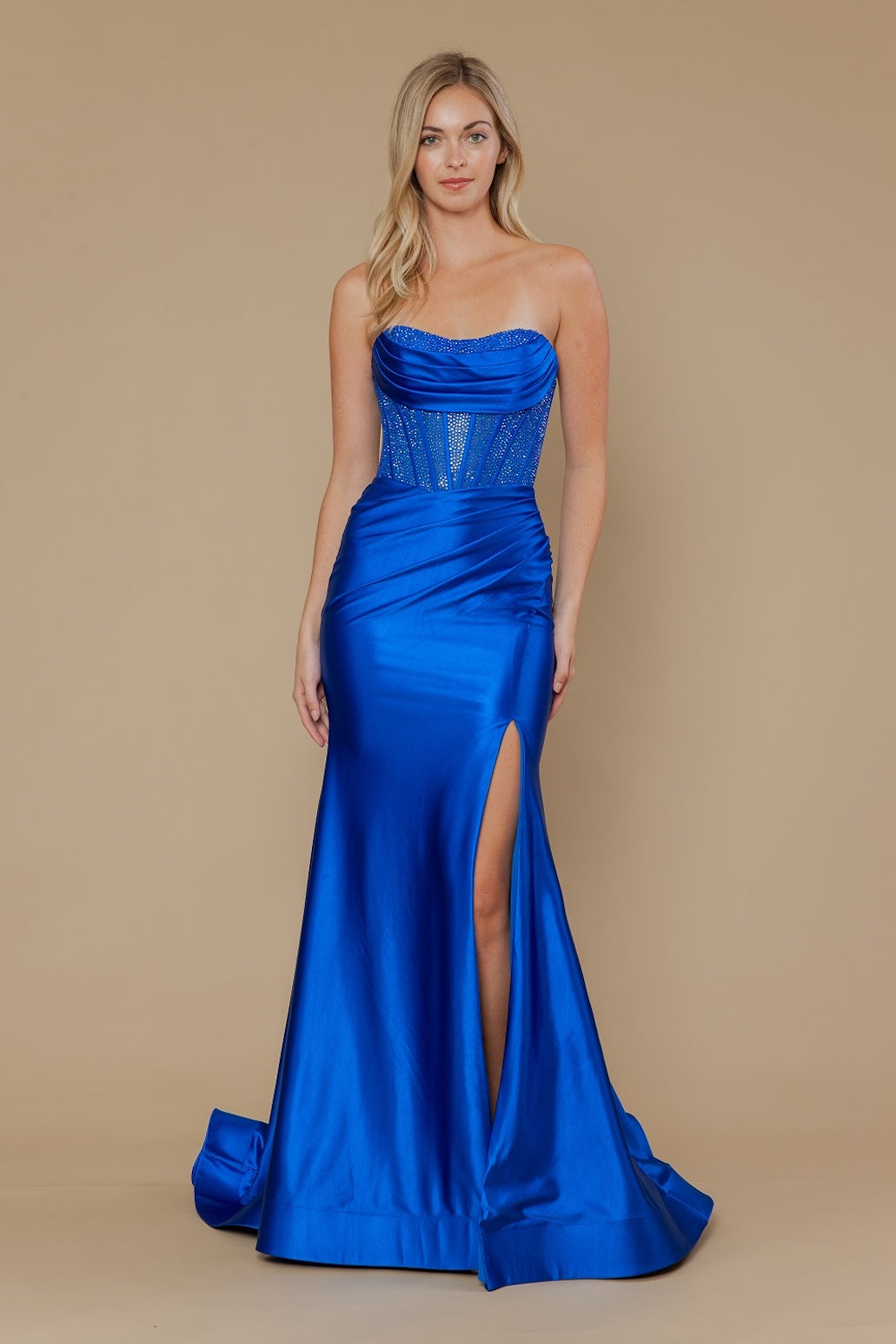 This dress features a strapless neckline with pleated detailing on the bust, a corset-style bodice with hot-fix stones and a lace-up back. To complete this design, the fitted silhouette is paired with a skirt slit. A stunning gown for your next prom or formal event.