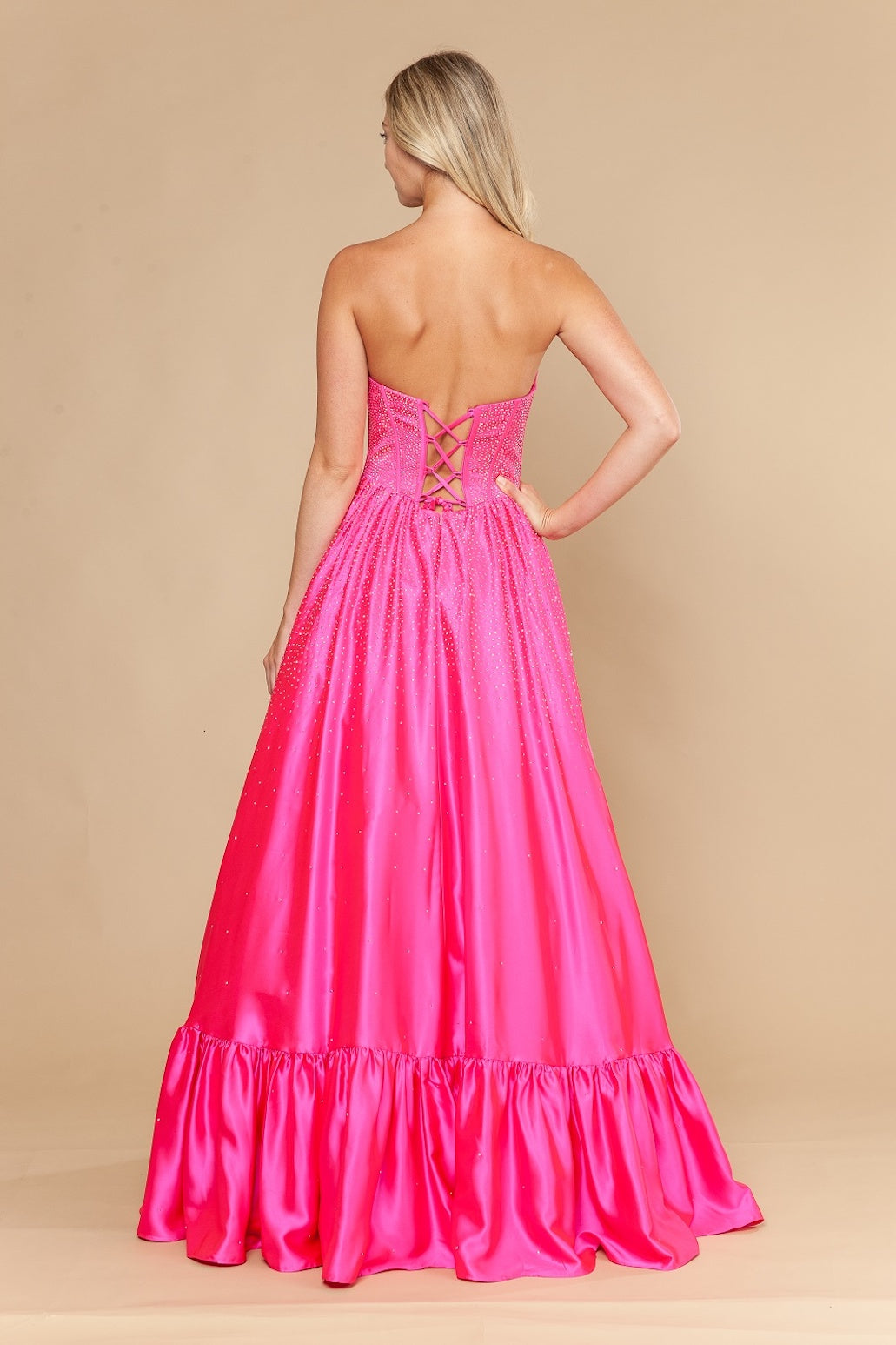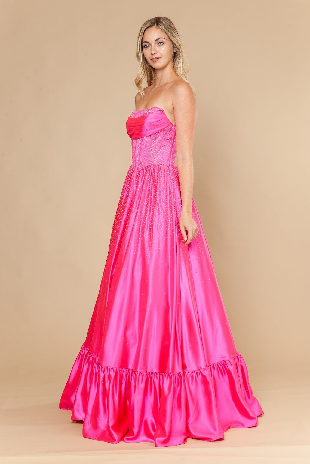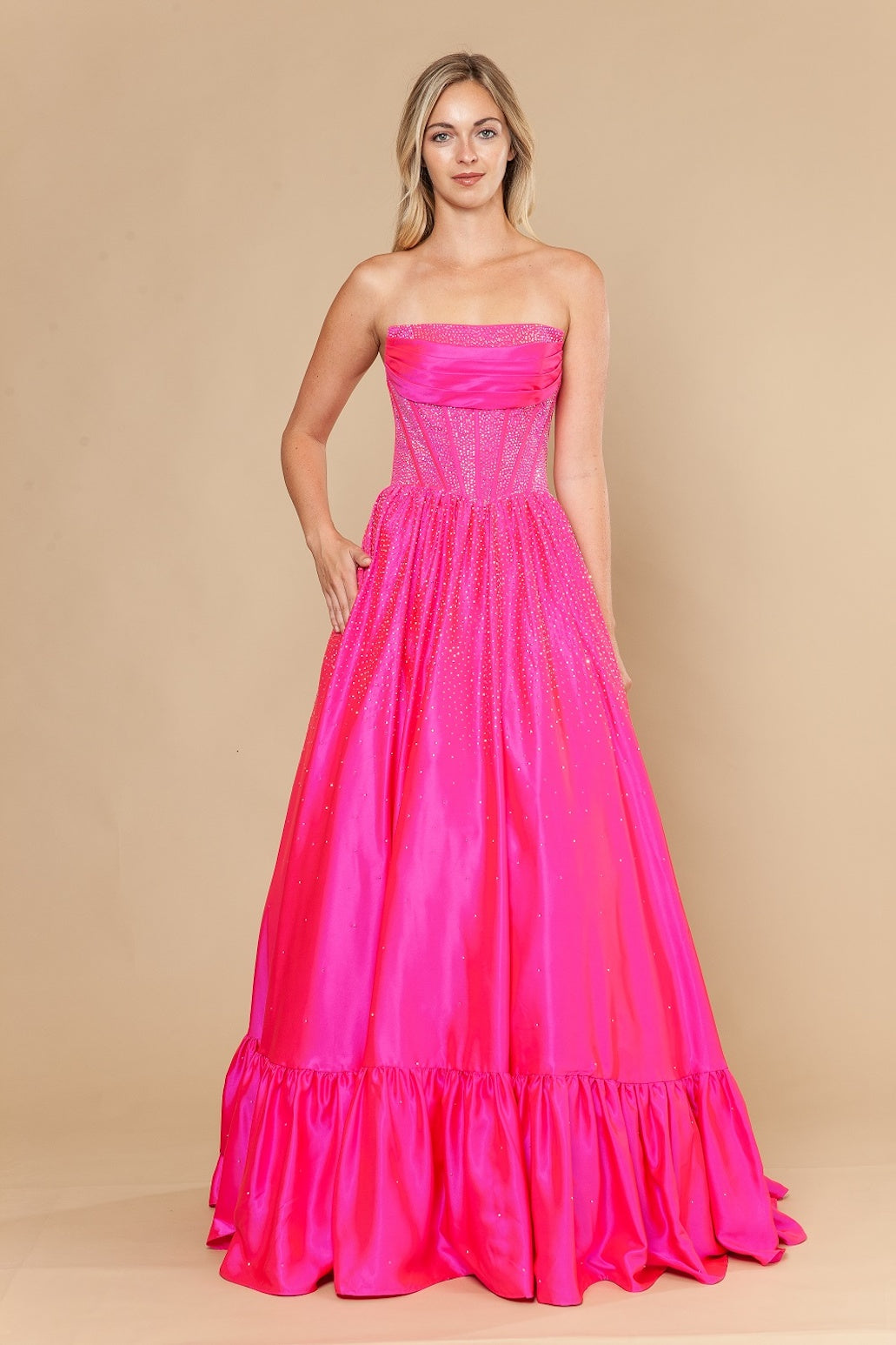This dress features a strapless neckline with a lace-up back, a pleated detailing on the bust and corset boning on the bodice with hot-fix stones throughout the fabric and a ruffle hemline to complete this A-line silhouette. Style this dress to make it your own at your next prom or formal event.