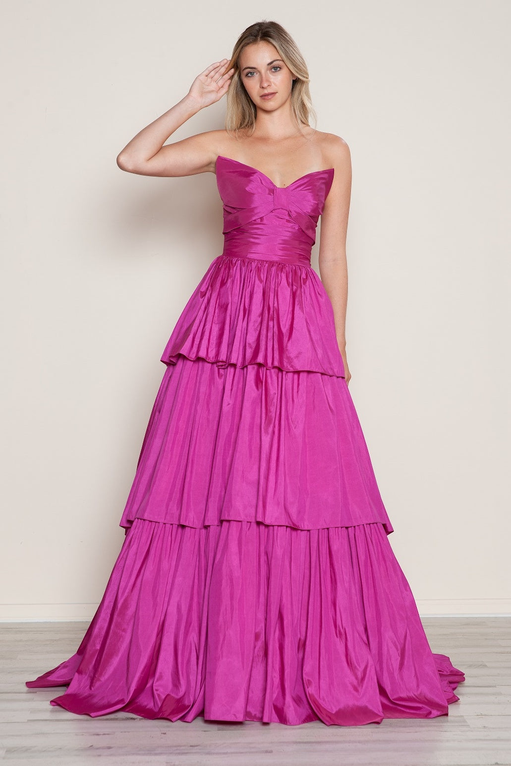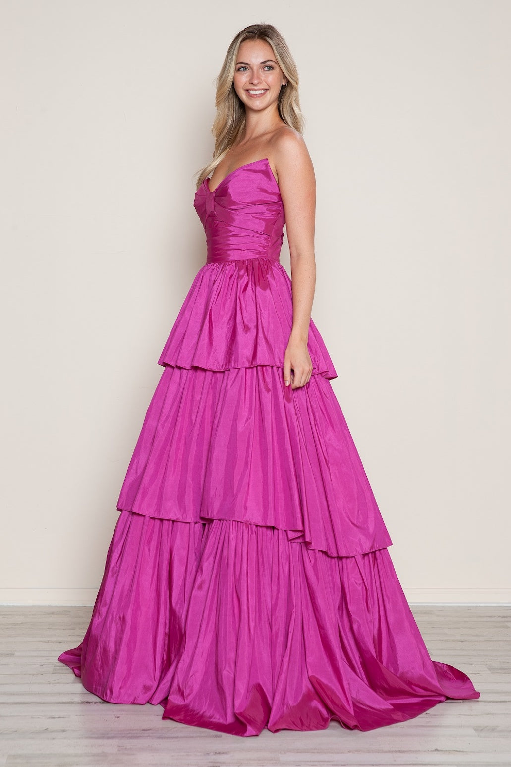 This dress features a strapless sweetheart neckline with taffeta fabric, a tiered layered skirt creating an A-line silhouette. Style this dress to make it your own at your next prom or formal event.
