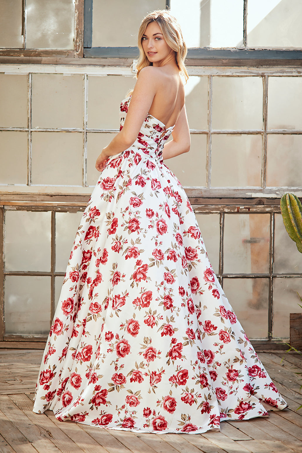 This ballgown features a strapless sweetheart neckline, a lace-up back, and a floral print fabric. A feminine and stunning choice for your next prom or formal event.