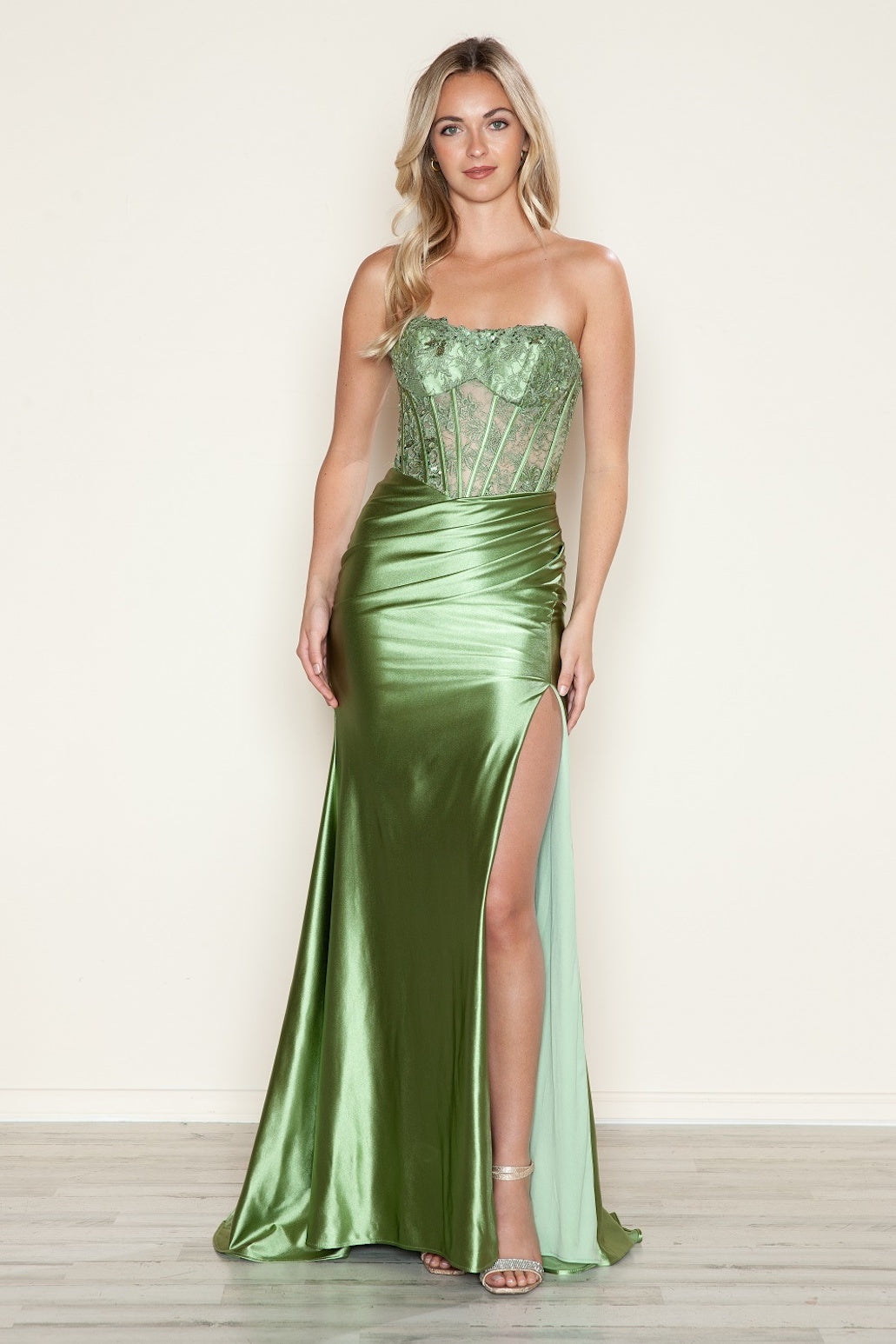 This dress features a strapless neckline with a lace bodice with corset-style boning, a lace-up back and a fitted silhouette with a skirt slit. Style this dress to make it your own at your next prom or formal event.