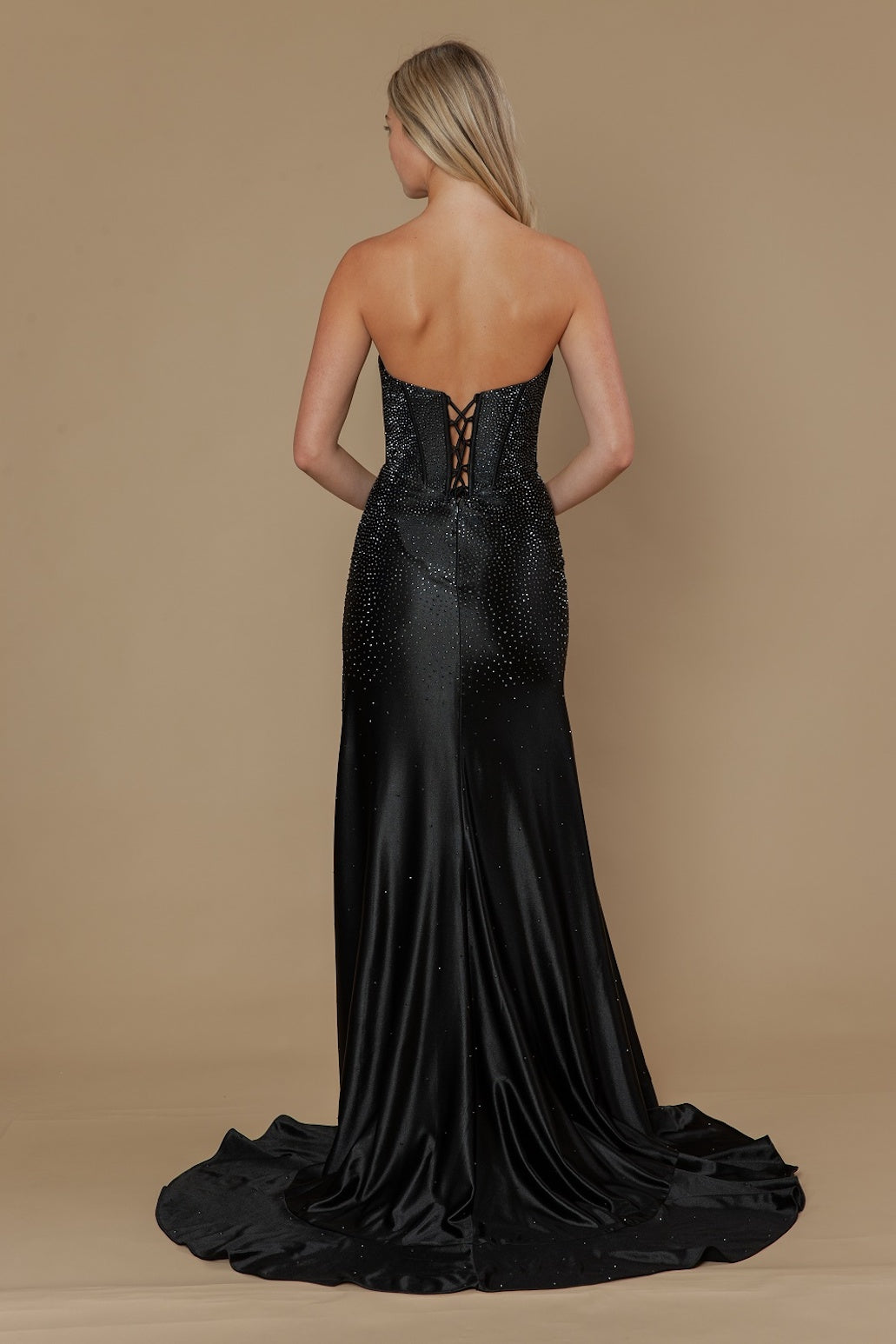 This dress features a strapless neckline, a corset-style bodice with pleated detailing on the bust, a lace-up back, a playful hemline and a fabric adorned with hot fix stones. A stunning choice for your next prom or formal event.