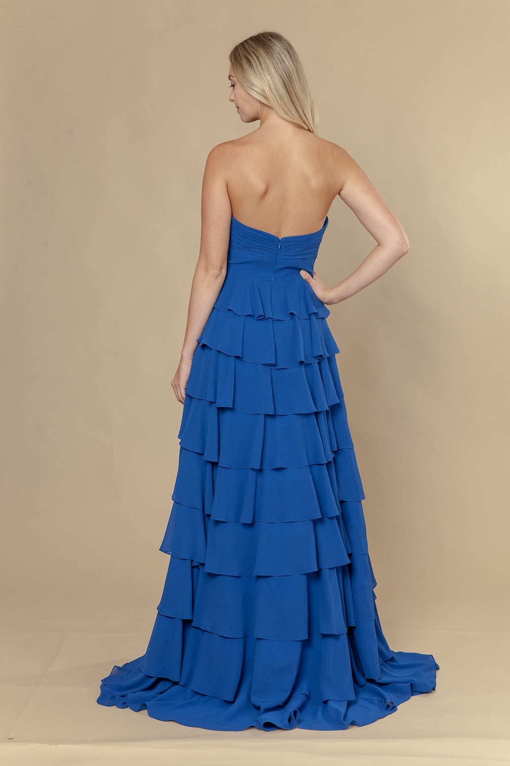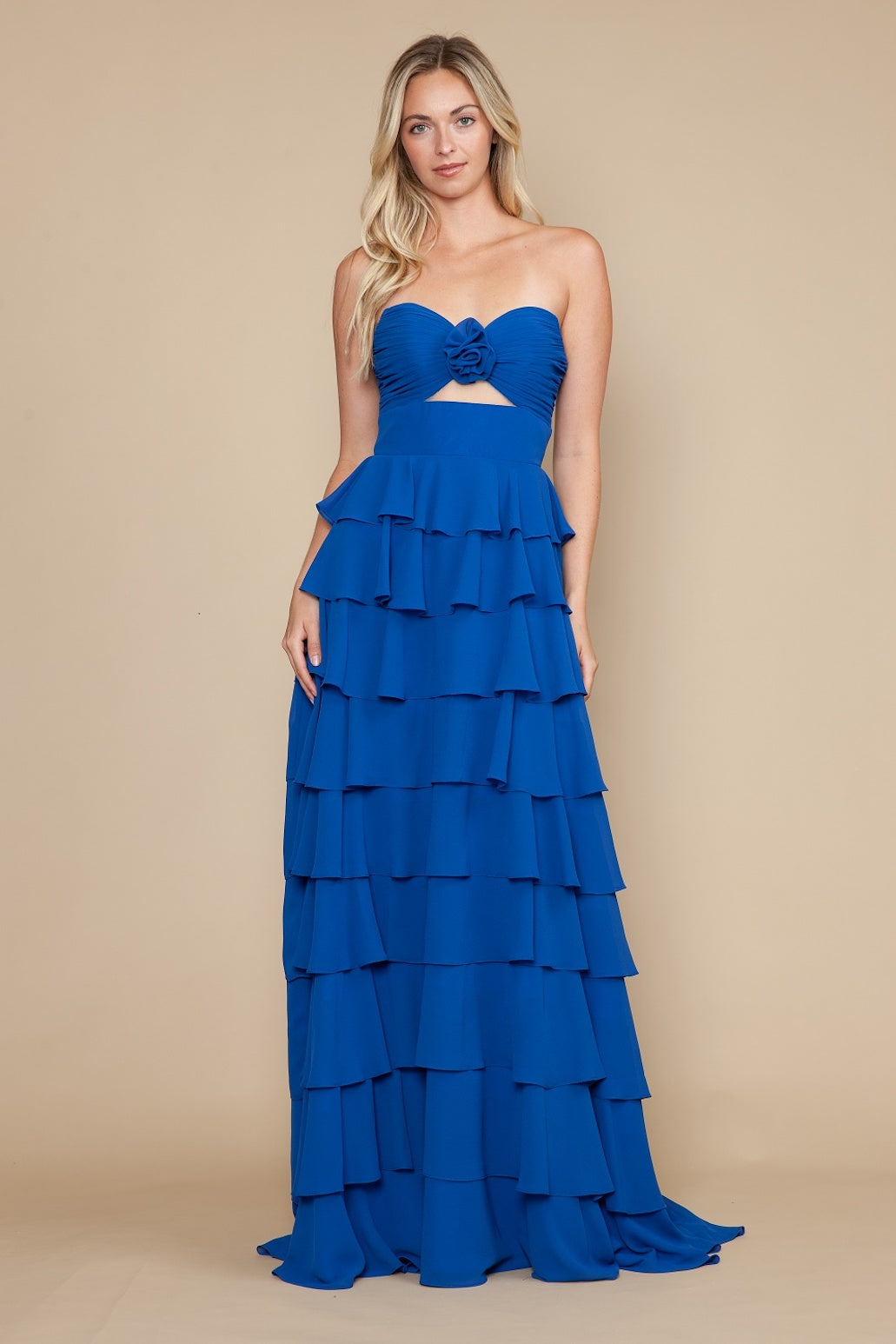 This dress features a strapless sweetheart neckline with a cutout detail beneath the bust, and a layered tiered skirt. Style this dress to make it your own at your next prom or formal event.