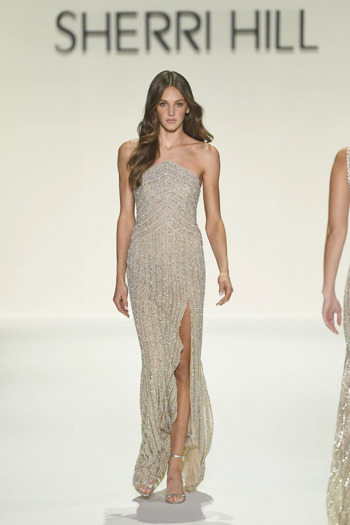 This dress features a strapless neckline with a fitted silhouette and fabric adorned with hot-fix stones. Style this dress to make it your own at your next prom or formal event.