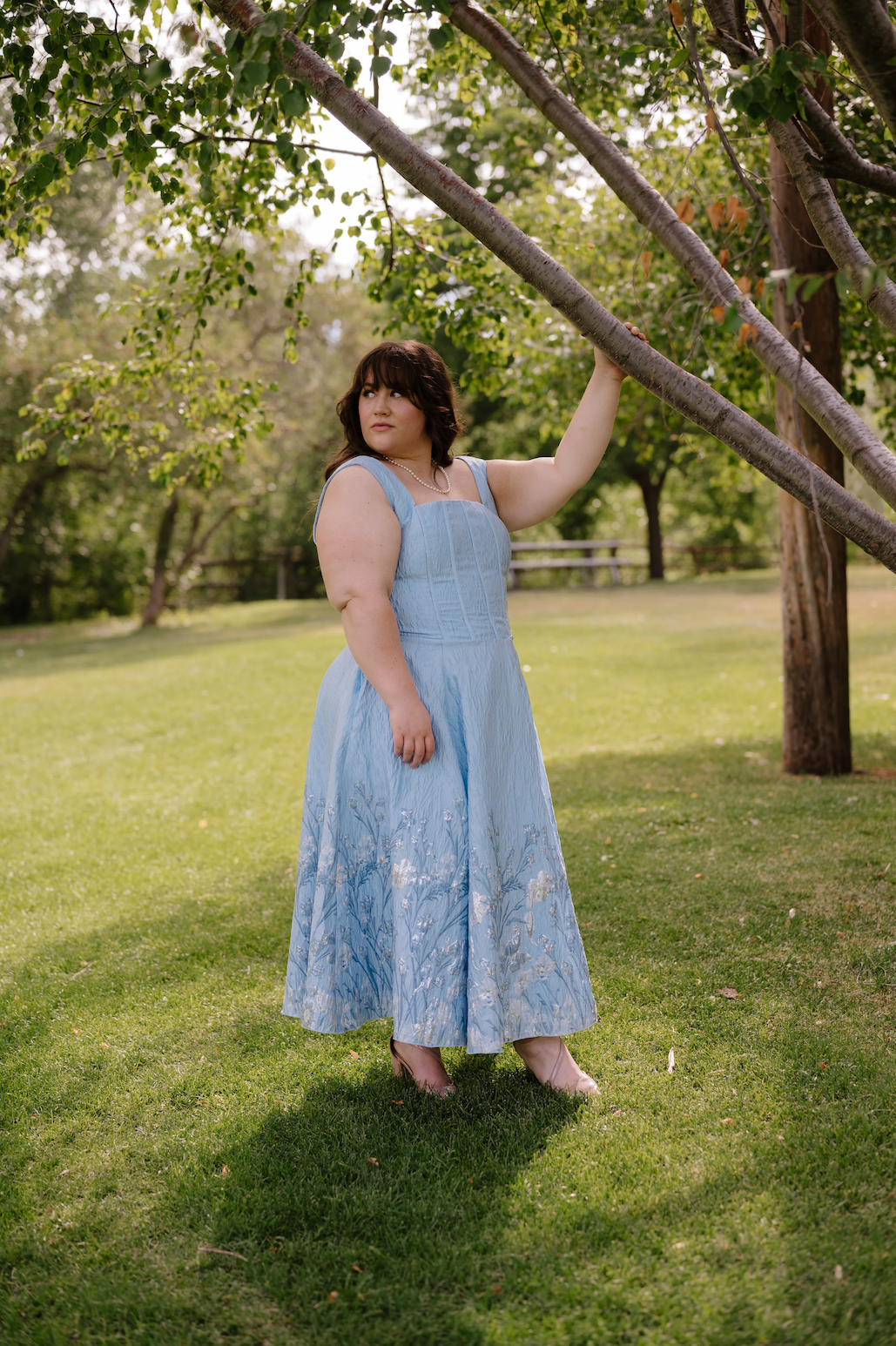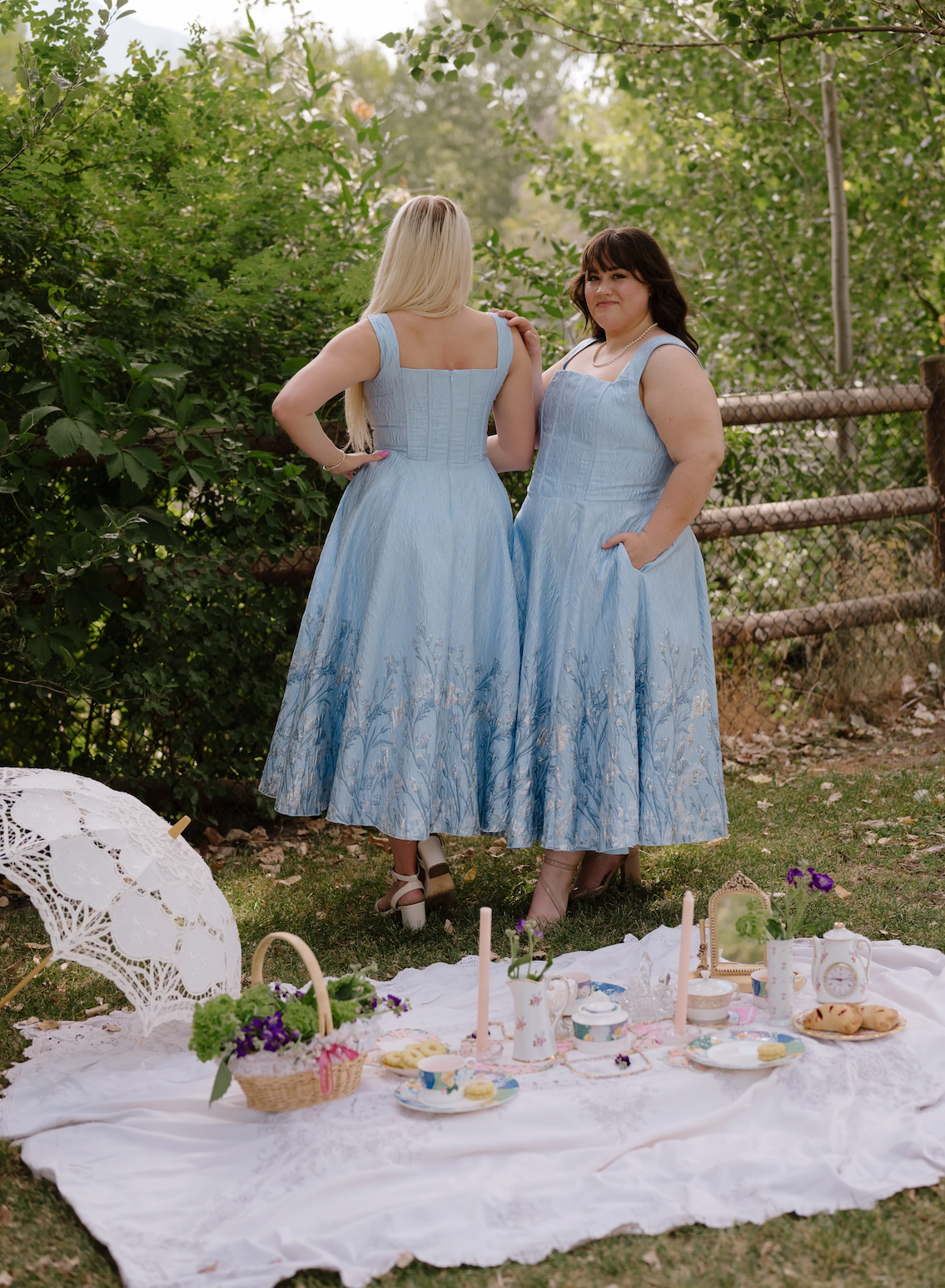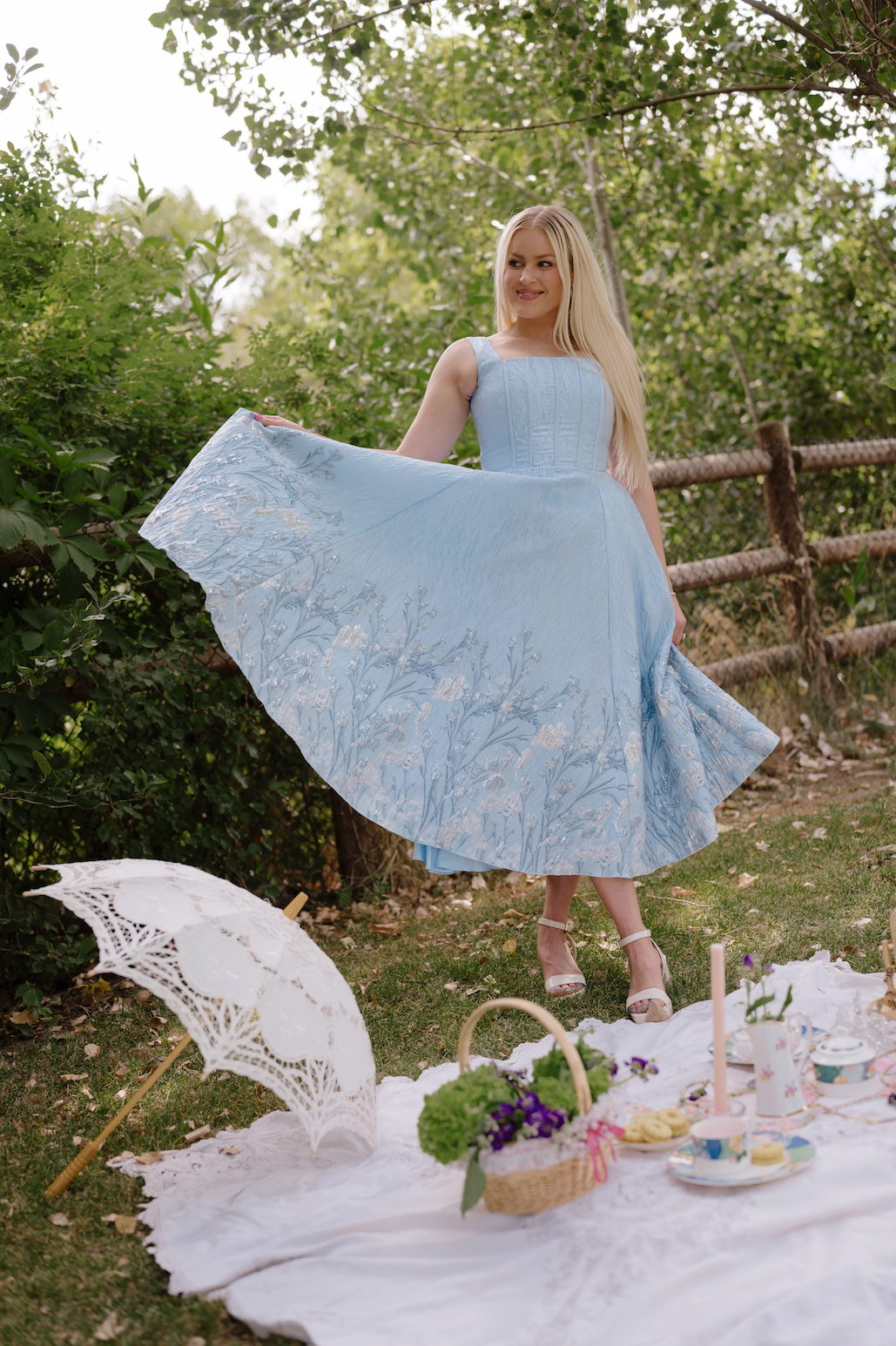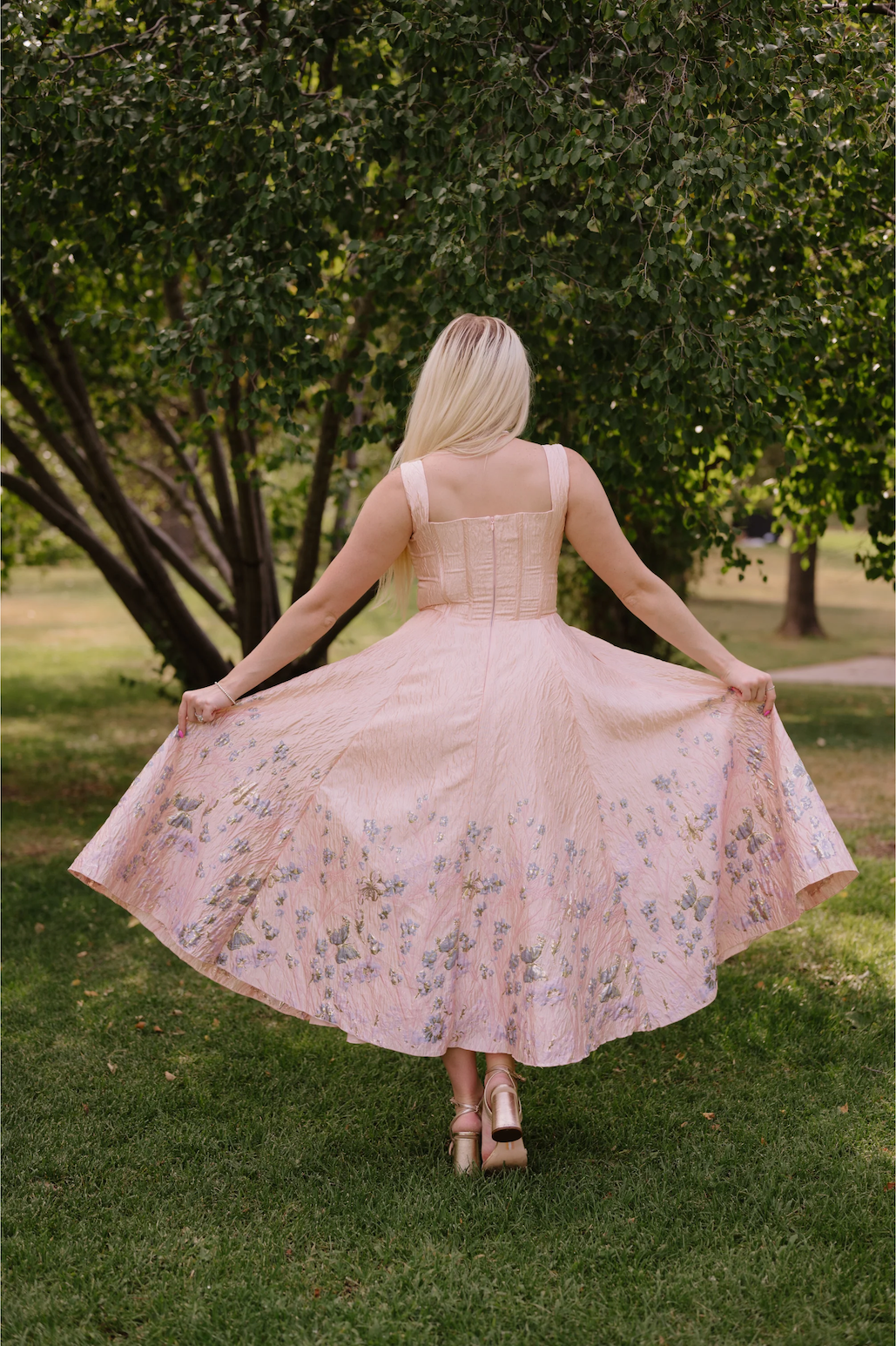 This tea length gown features a brocade foil design, a corset-style top with hidden cups, pockets, and thick straps with a full zippered back. Style this dress to make it your own at your next homecoming or formal event!