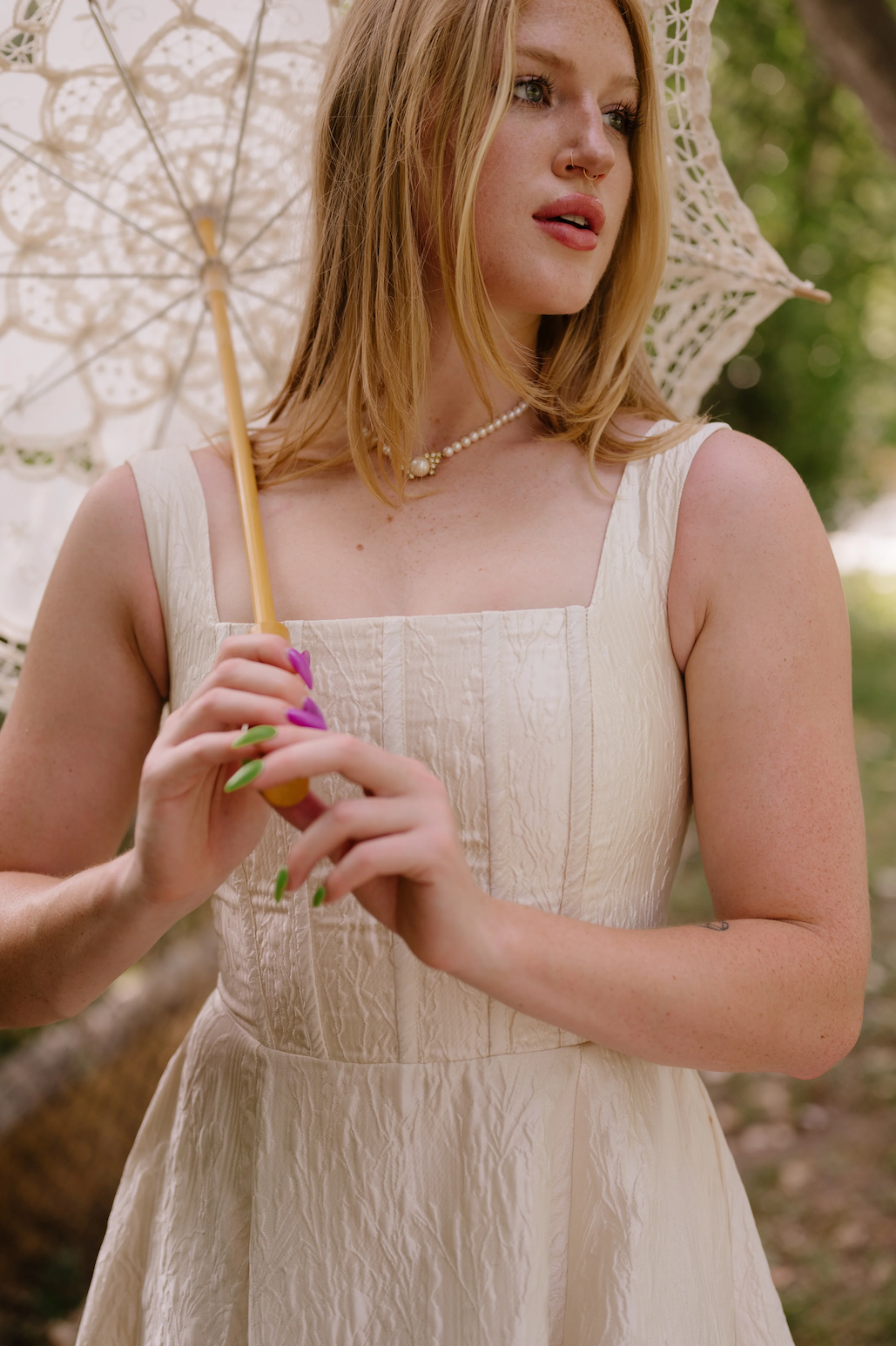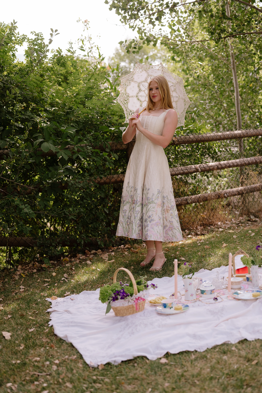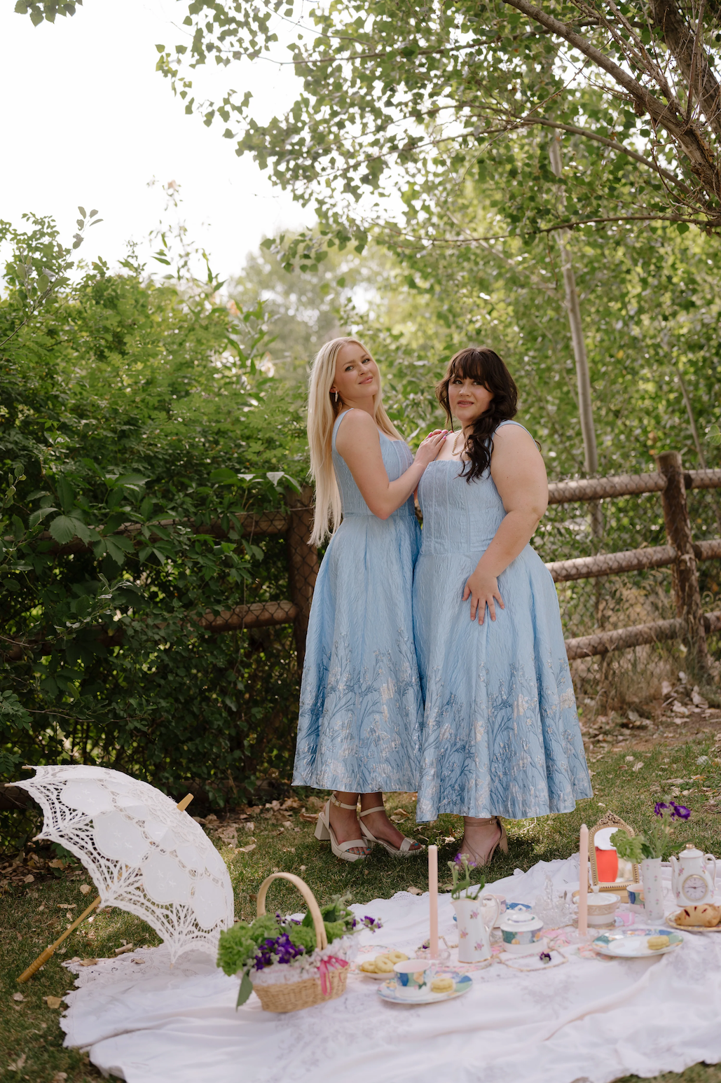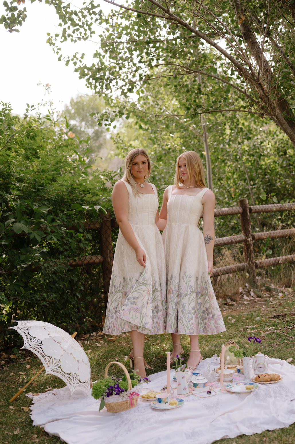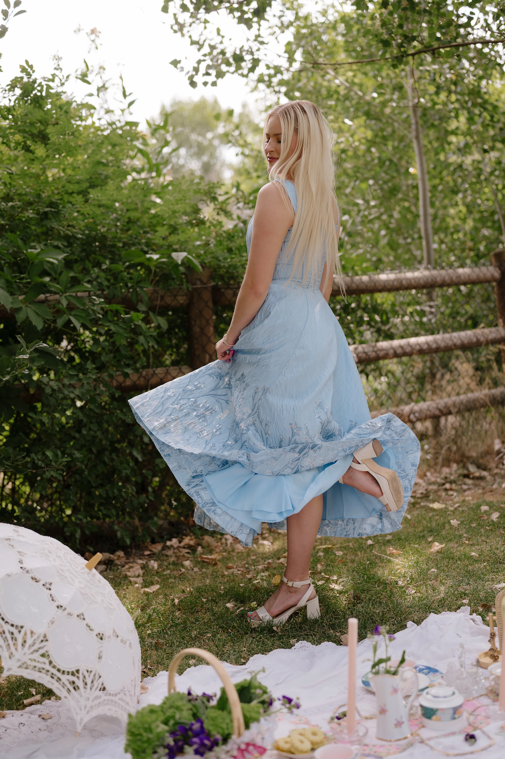 This tea length gown features a brocade foil design, a corset-style top with hidden cups, pockets, and thick straps with a full zippered back. Style this dress to make it your own at your next homecoming or formal event!