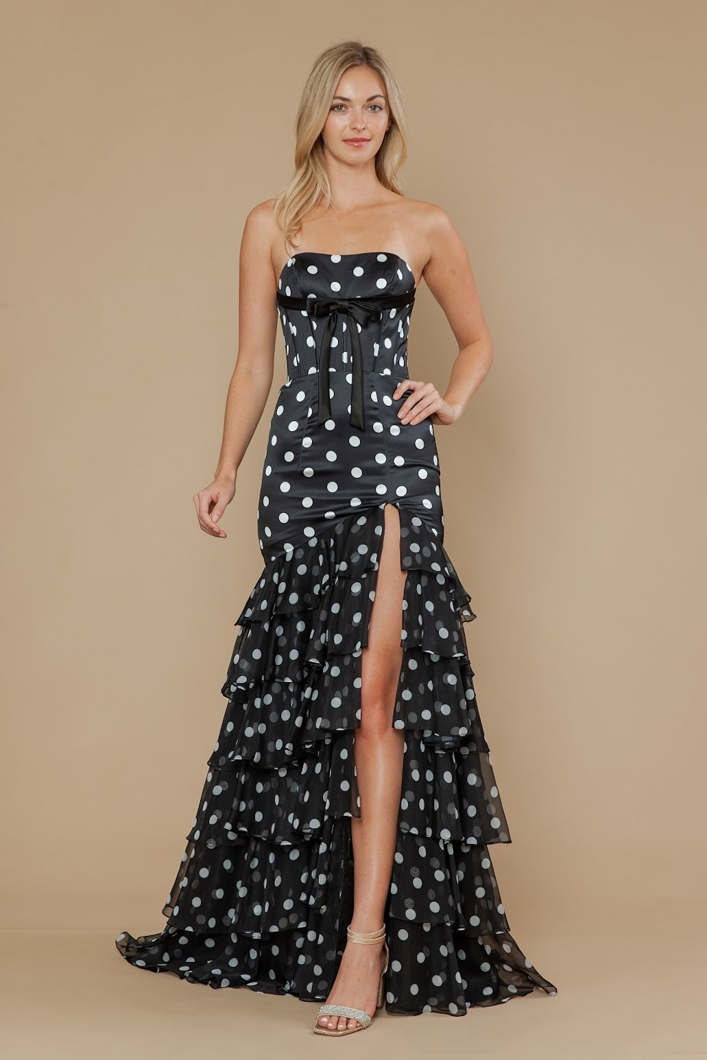 This dress features a strapless neckline, a bow below the bust, a bodice with corset boning and a lace-up back. A mermaid silhouette with tiered ruffle layers and a polka dot fabric complete this one-of-a-kind look that could be ideal for your next prom or formal event.