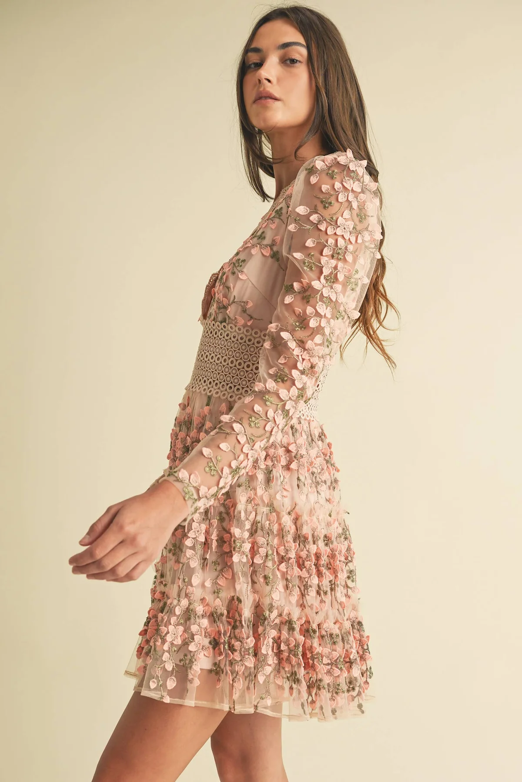 This cocktail dress features delicate floral embroidery with crochet lace trim, long sheer sleeves and a V-neckline. This dress is boho and feminine and could be ideal for your next homecoming or formal event.