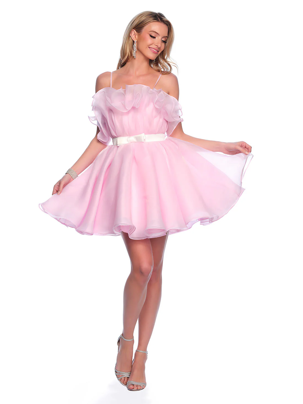This cocktail dress features a ruffle neckline with spaghetti straps, a belt with a bow along the waistline, and a fit-and-flare silhouette. This dress is playful and unique and could be just the vibe for your next homecoming or formal event.